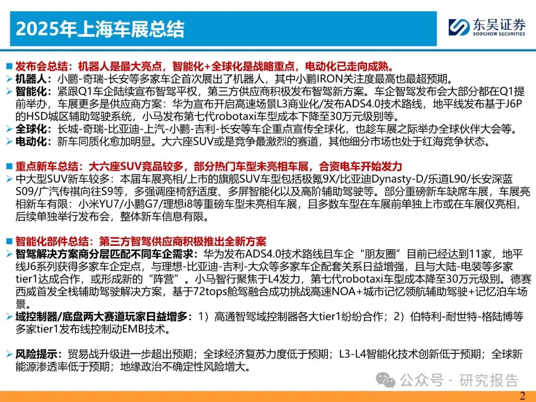 智能化进程:延续第一季度行业趋势,主机厂持续推进智能驾驶技术普惠化,供应链企业密集发布创新解决方案。值得注意的是,主机厂智驾主题发布会多集中于Q1季度,本次展会更多呈现供应商技术突破:1)华为正式启动高速场景L3级商用进程并发布ADS4.0技术架构;2)地平线推出基于征程6平台的HSD城市领航系统;3)小马智行第七代自动驾驶车型实现成本突破,下探至30万元价格区间
