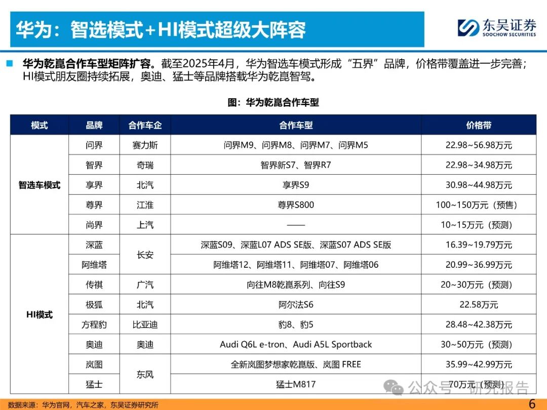 智驾解决方案呈现梯队化发展:1)华为ADS4.0技术平台已扩展至11家战略合作伙伴;2)地平线征程6系列获多家主机厂定点,与理想汽车、比亚迪、吉利集团、大众中国等深化合作,同时联合大陆集团、电装等一级供应商构建新型产业联盟;3)小马智行持续深耕L4领域,第七代自动驾驶车型实现成本优化;4)德赛西威推出行业首款全栈式智驾方案,基于72TOPS算力平台实现高速领航+城市记忆导航+智能泊车全场景覆盖