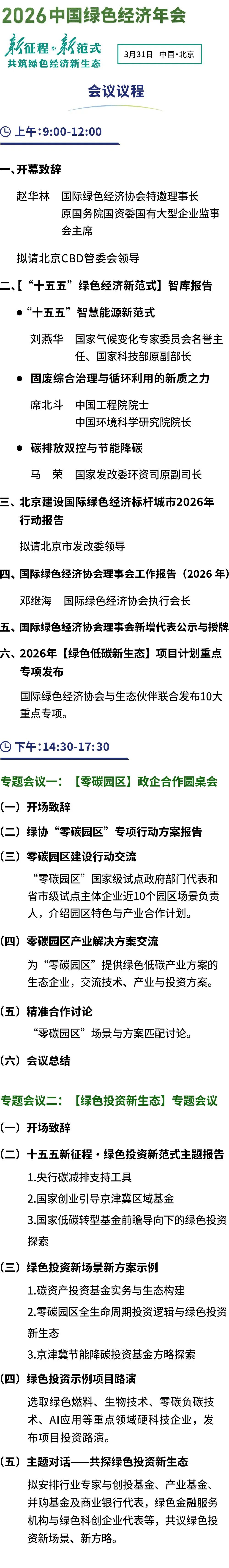 会议将邀请权威专家解析“央行8000亿碳减排支持工具”“国家创业投资引导京津冀区域基金500亿扩容”等国家投资新政,研讨“碳资产”“节能降碳”“零碳园区”“绿色燃料”“AI应用”等重点领域的绿色投资方略。聚合多层次资本协同与多场景科技产业力量,共筑绿色投资新生态。