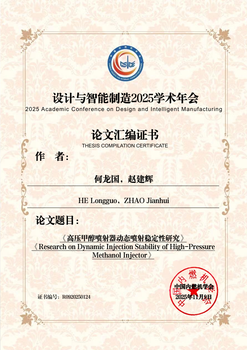 最终,经过专家评审,博士研究生何龙国的论文《高压甲醇喷射器动态喷射稳定性研究》被评为优秀会议论文。