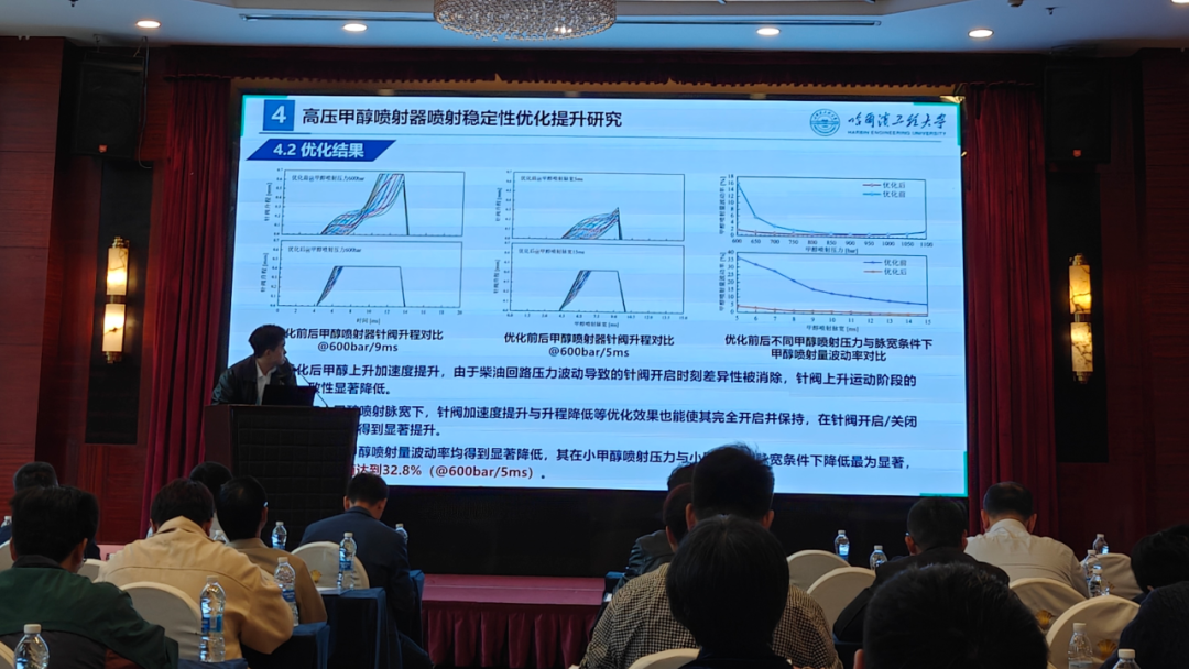 博士研究生何龙国以《高压甲醇喷射器动态喷射稳定性研究》为题介绍了针对双介质异频压力波动耦合叠加下甲醇动态喷射稳定性的影响机理,提出了高压甲醇喷射器动态喷射稳定性提升设计方法,实现甲醇喷射量波动率最大降低32.8%。
