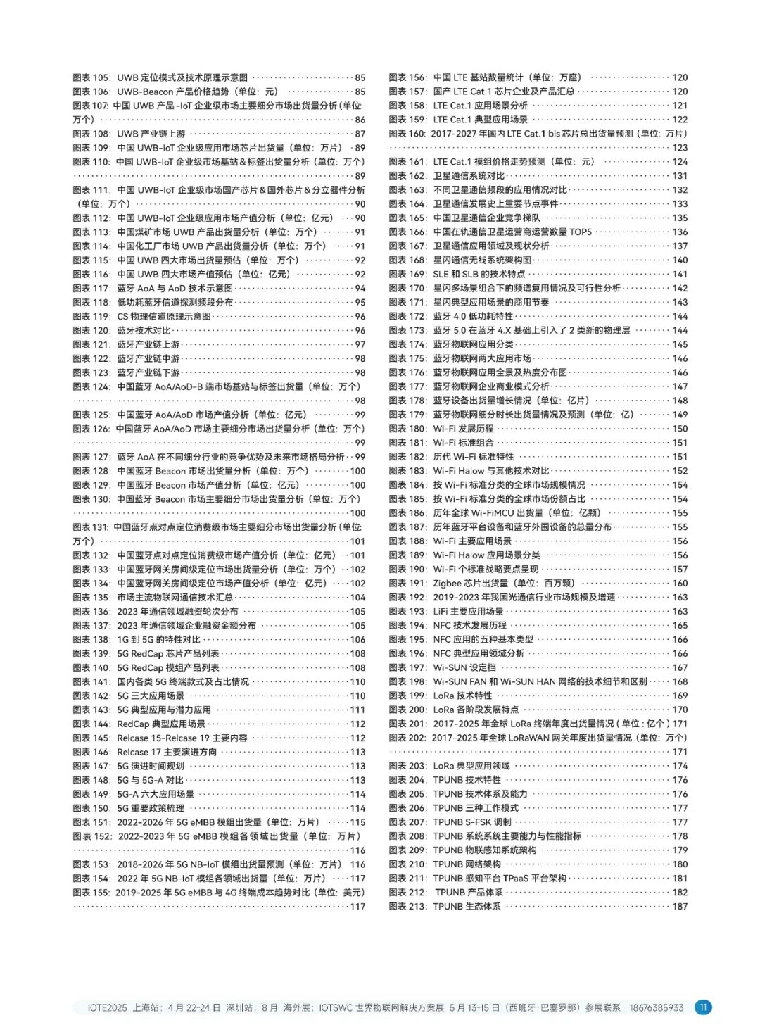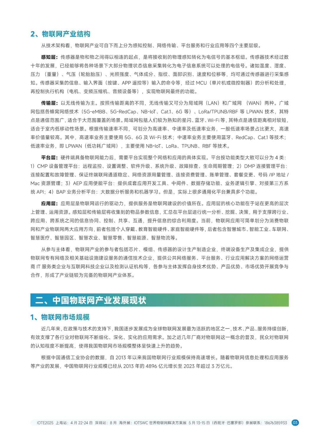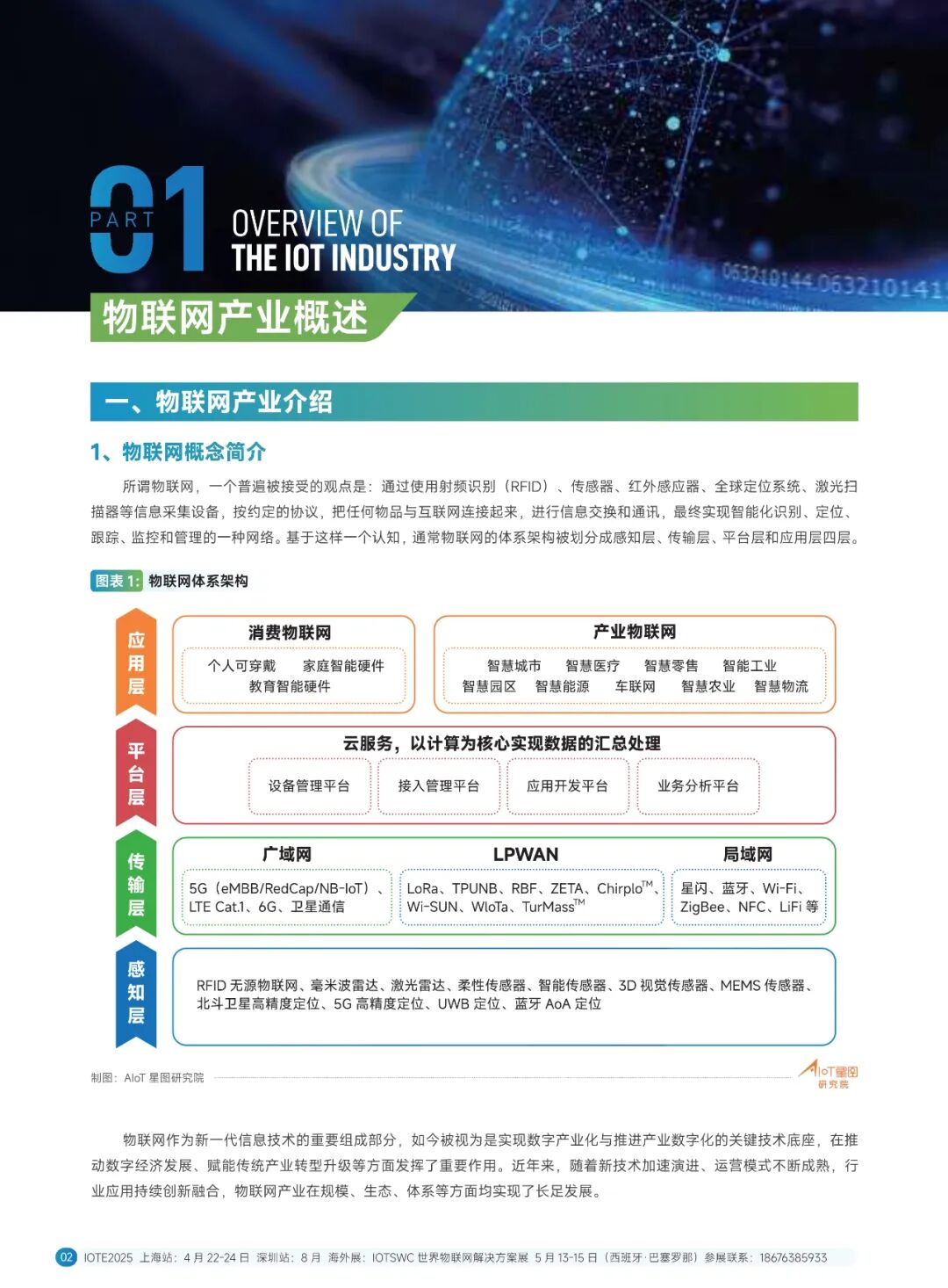 技术线方面,系统地介绍了感知层(覆盖了 RFID 无源物联网、毫米波雷达、激光雷达、柔性传感器、智能传感器、3D视觉传感器、MEMS 传感器、北斗高精度定位、GPS 高精度定位、5G 高精度定位、UWB 定位、蓝牙 AoA 定位、慢性导航技术、超声波技术、红外技术等十几种感知定位技术)、传输层(覆盖了主流物联网无线通信技术,如 5G eMBB、RedCap、NB-0T、LTECat1、6G、卫星通信、星闪、蓝牙、W-Fi、ZigBee、NFC、LIFi、LORa、TPUNB、RBF.ZETA、ChirpIOT™、W-SUN、WoTa、TurMass™、LaKi等超二十种通信技术)和平台层(覆盖了平台、操作系统、数据库以及大模型等多个方面)。