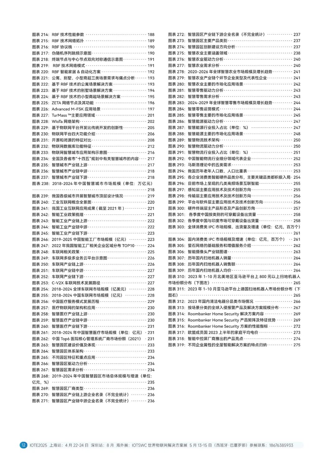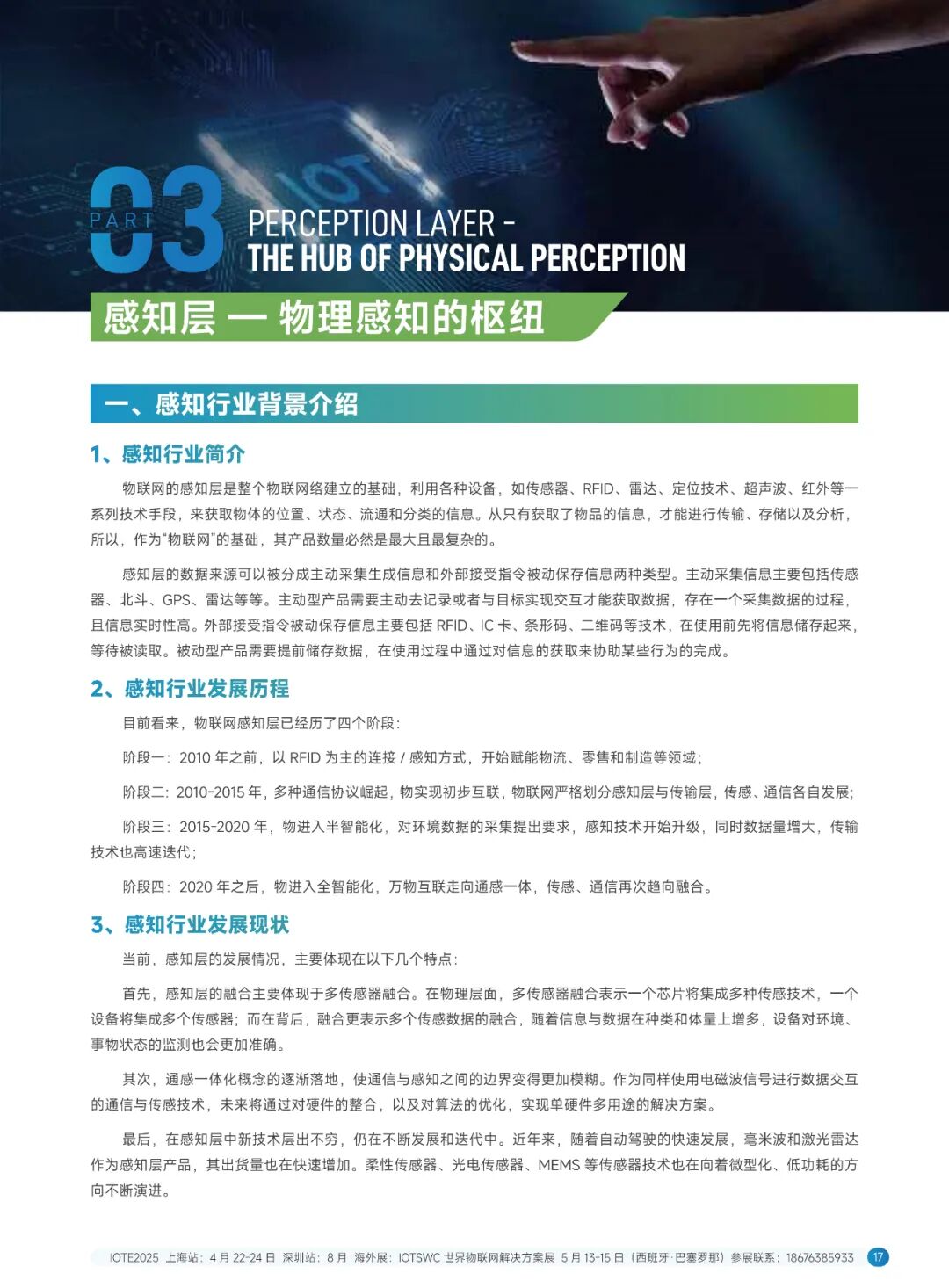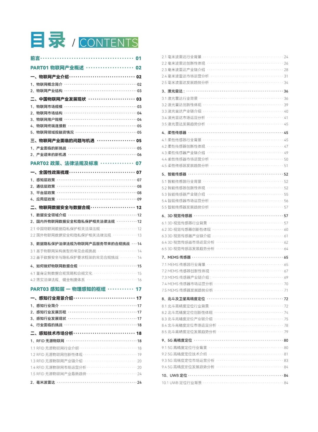 技术线方面,系统地介绍了感知层(覆盖了 RFID 无源物联网、毫米波雷达、激光雷达、柔性传感器、智能传感器、3D视觉传感器、MEMS 传感器、北斗高精度定位、GPS 高精度定位、5G 高精度定位、UWB 定位、蓝牙 AoA 定位、慢性导航技术、超声波技术、红外技术等十几种感知定位技术)、传输层(覆盖了主流物联网无线通信技术,如 5G eMBB、RedCap、NB-0T、LTECat1、6G、卫星通信、星闪、蓝牙、W-Fi、ZigBee、NFC、LIFi、LORa、TPUNB、RBF.ZETA、ChirpIOT™、W-SUN、WoTa、TurMass™、LaKi等超二十种通信技术)和平台层(覆盖了平台、操作系统、数据库以及大模型等多个方面)。