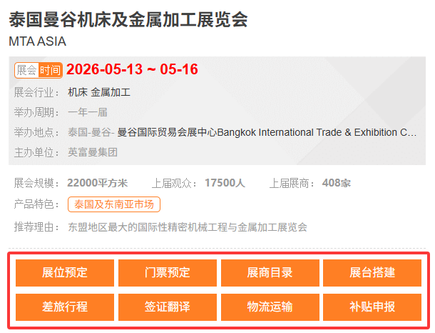 泰国曼谷机床及金属加工展览会MTA ASIA【展位预定、门票预定、展商目录、展台搭建、差旅行程、签证、翻译、物流运输、补贴申报】