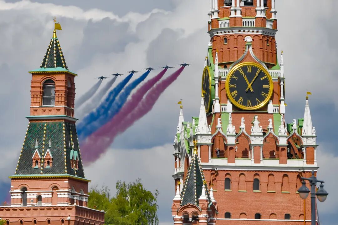 5月7日,在俄罗斯首都莫斯科,战机编队参加纪念苏联伟大卫国战争胜利80周年阅兵式彩排。