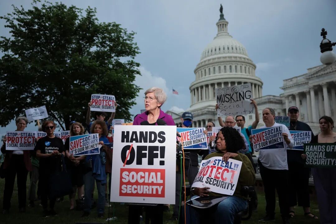 美国社保局裁员抗议。美国民主党参议员 Elizabeth Warren 参加反对削减联邦社保机构的集会,华盛顿特区。5月6日,美国参议院表决通过美国总统 Donald Trump 提名的前金融科技行业高管 Frank Bisignano 出任联邦社会保障局局长。美国「政府效率部」主导的裁员计划预计将导致社保局削减7000名雇员,占员工总数的12%,并关闭近40个办事处。美国联邦社保局每月为超过7300万人发放社保金,相当于该国总人口的20%。