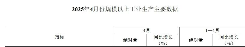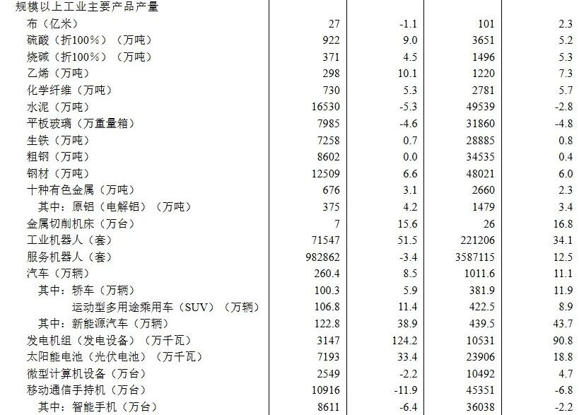 分产品看,4月份,规模以上工业623种产品中有341种产品产量同比增长。其中,钢材12509万吨,同比增长6.6%;水泥16530万吨,下降5.3%;十种有色金属676万吨,增长3.1%;乙烯298万吨,增长10.1%;汽车260.4万辆,增长8.5%,其中新能源汽车122.8万辆,增长38.9%;发电量7111亿千瓦时,增长0.9%;原油加工量5803万吨,下降1.4%。
