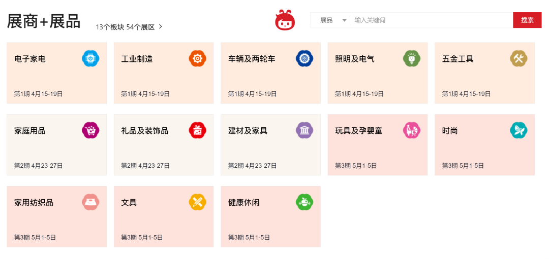 第一期 (4月15日-19日):电子家电、工业制造、车辆及两轮车、照明及电气、五金工具