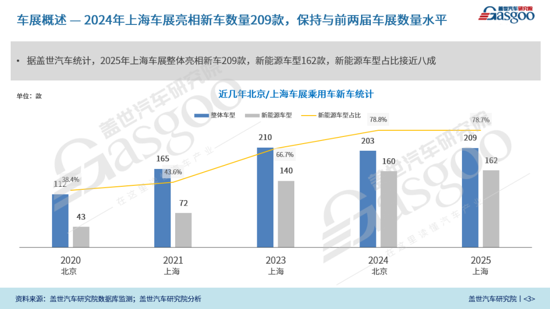 根据盖世汽车数据统计,尽管现代、起亚、捷尼赛思、东风雪铁龙、东风标致、劳斯莱斯、兰博基尼、玛莎拉蒂、阿斯顿马丁、捷豹路虎、极星等品牌缺席本届车展,但是2025年上海国际车展亮相乘用车新车数量依然高达209款,新能源汽车新车占比接近7成,连续三年保持A级大型车展展车数量水平。