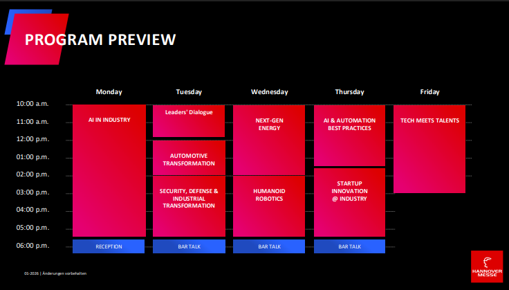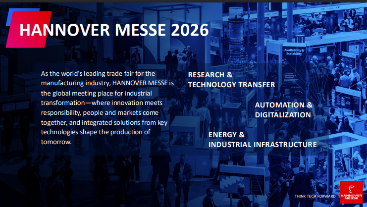 作为全球工业领域的“风向标”与创新策源地,2026年汉诺威工业博览会(HANNOVER MESSE) 将于4月20日至24日在德国汉诺威展览中心盛大启幕。本届展会以 “Think Tech Forward”(科技展望未来) 为主题,重点聚焦人工智能、自动化和数字化,旨在展示下一代制造、智能基础设施和创新驱动的合作。