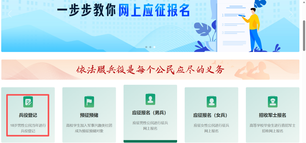 登录系统以后,点击右侧的“ 开始兵役登记 ”进行兵役登记啦!