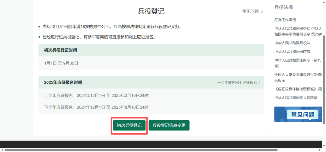 在这个页面中,会告知我们报名时间以及参军的政策说明,建议看后,点击“ 初次兵役登记 ”,迈出你军旅生涯的第一步吧!