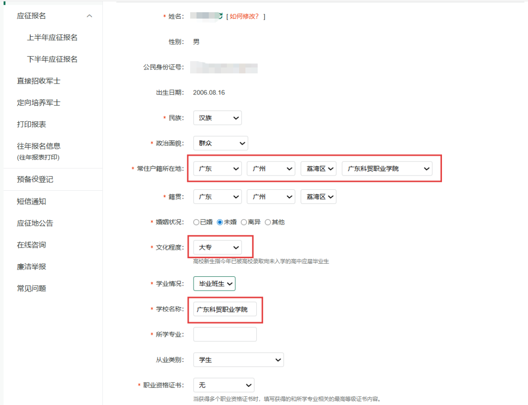 点击“开始兵役登记”按钮后,进入兵役登记信息填写页面。