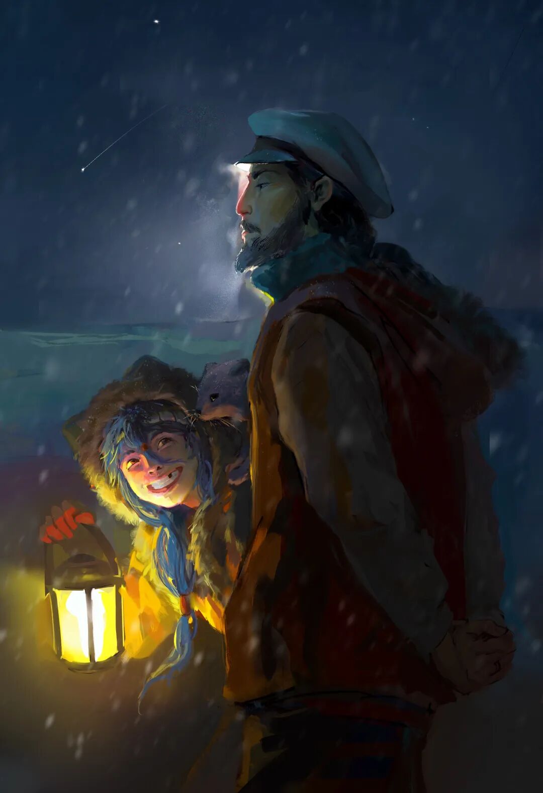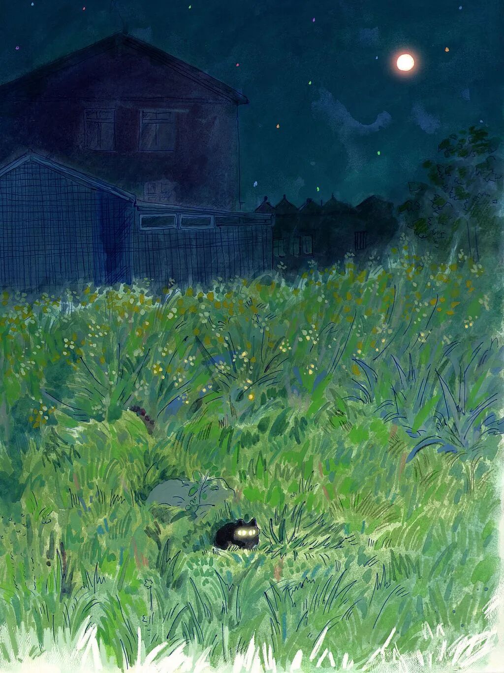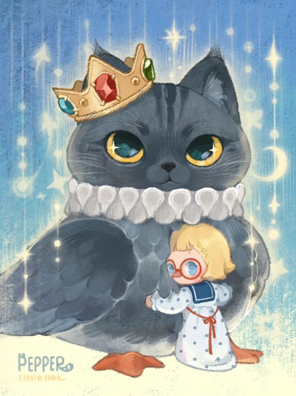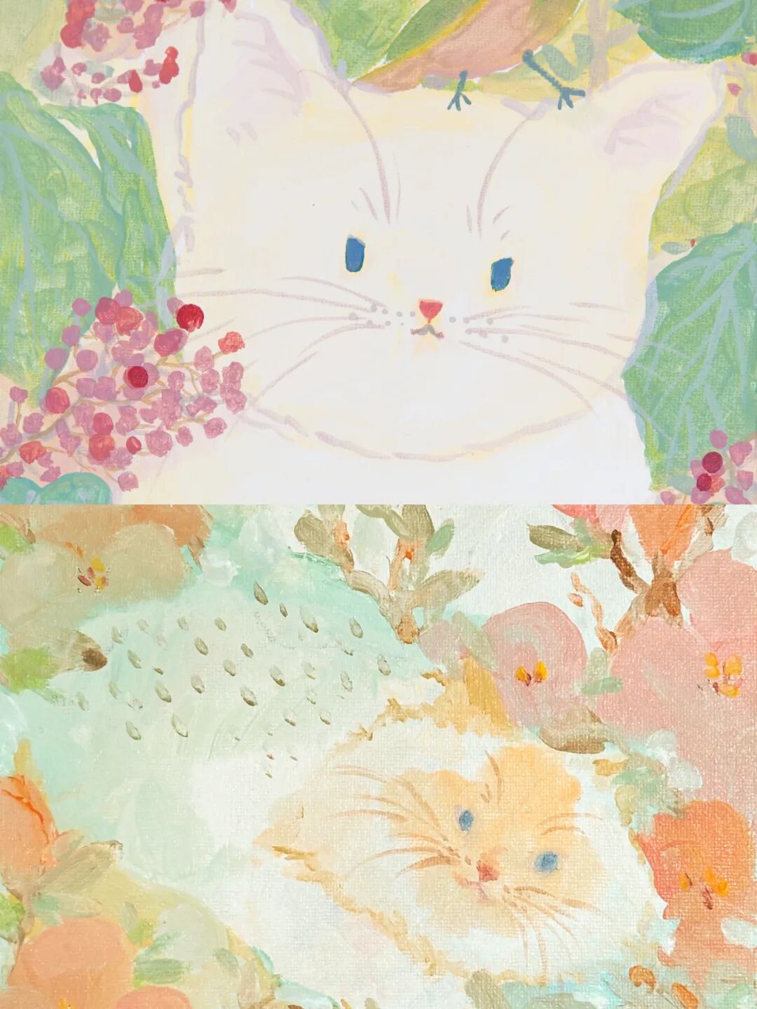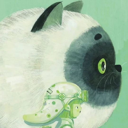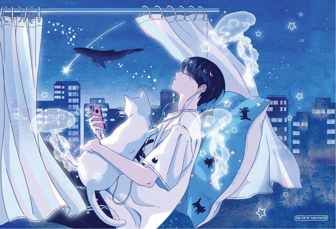 我的猫有着柔软的毛发和闪闪发亮的眼睛。那种静静地躺在猫咪身旁的时刻,是我最放松、最幸福的瞬间。我们想在画中捕捉下每一个这样的温暖时刻。