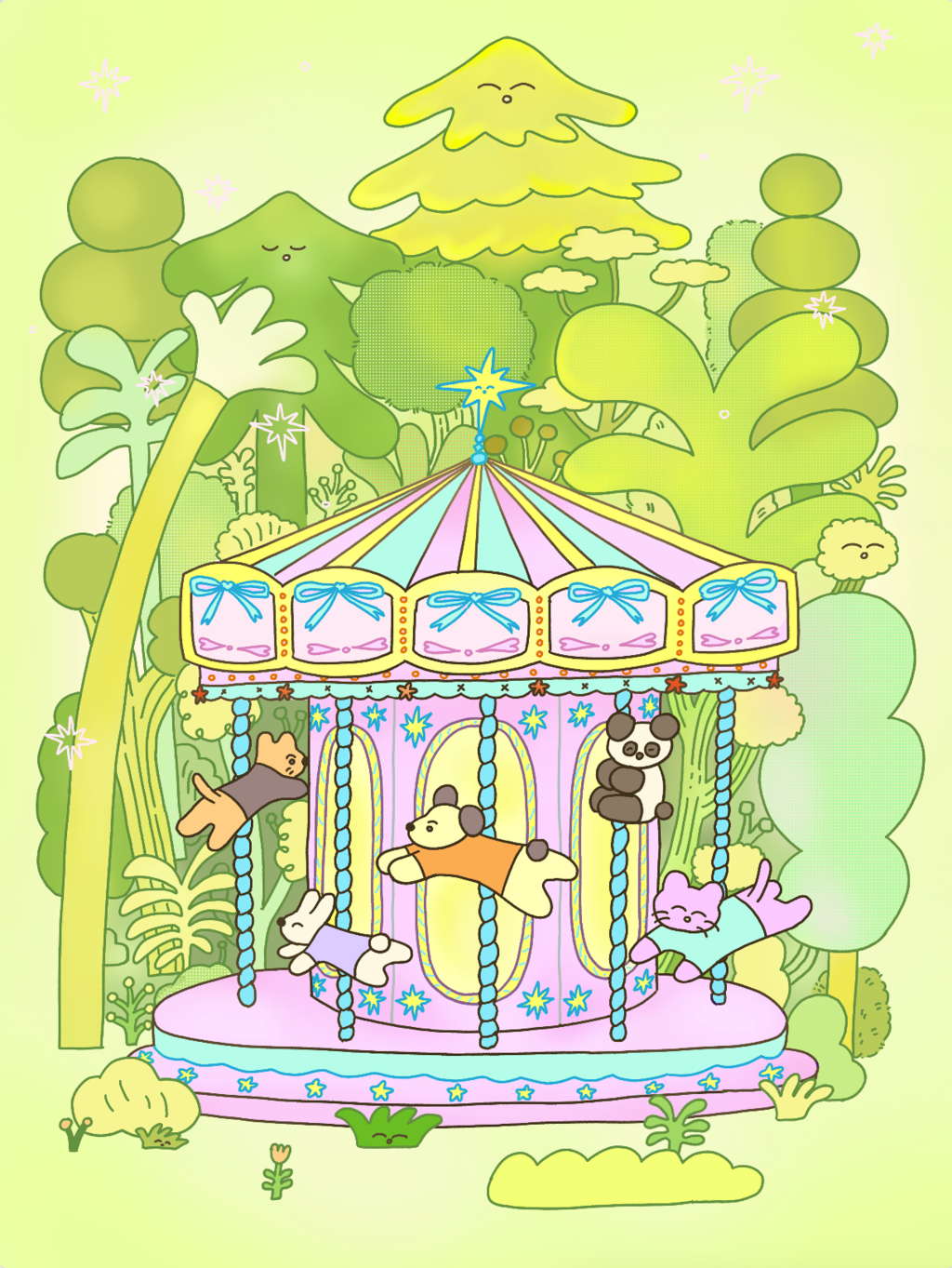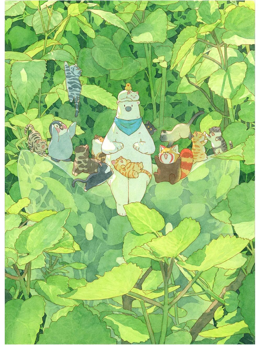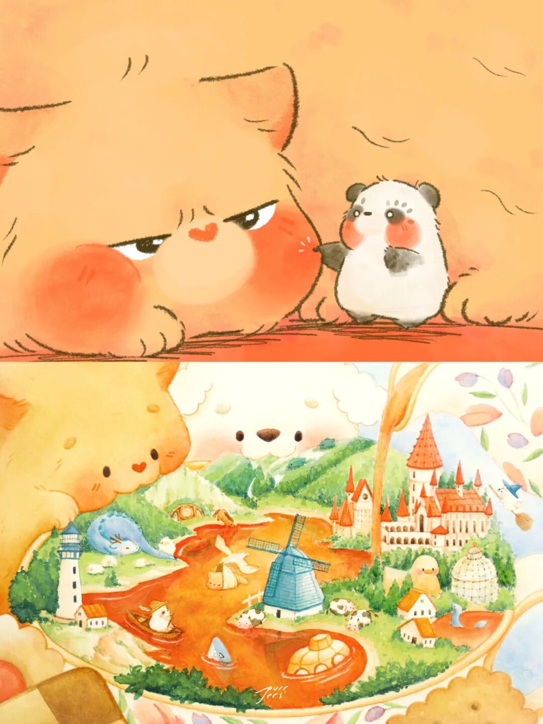 画风治愈,梦幻,多以动物为主,希望通过作品创造出一个美好且自由的乐园,可爱的动物与柔和的色彩形成治愈的画面。作品梦幻现实相交,童真且柔和,希望在繁忙的生活中为大家带来一点治愈的色彩。