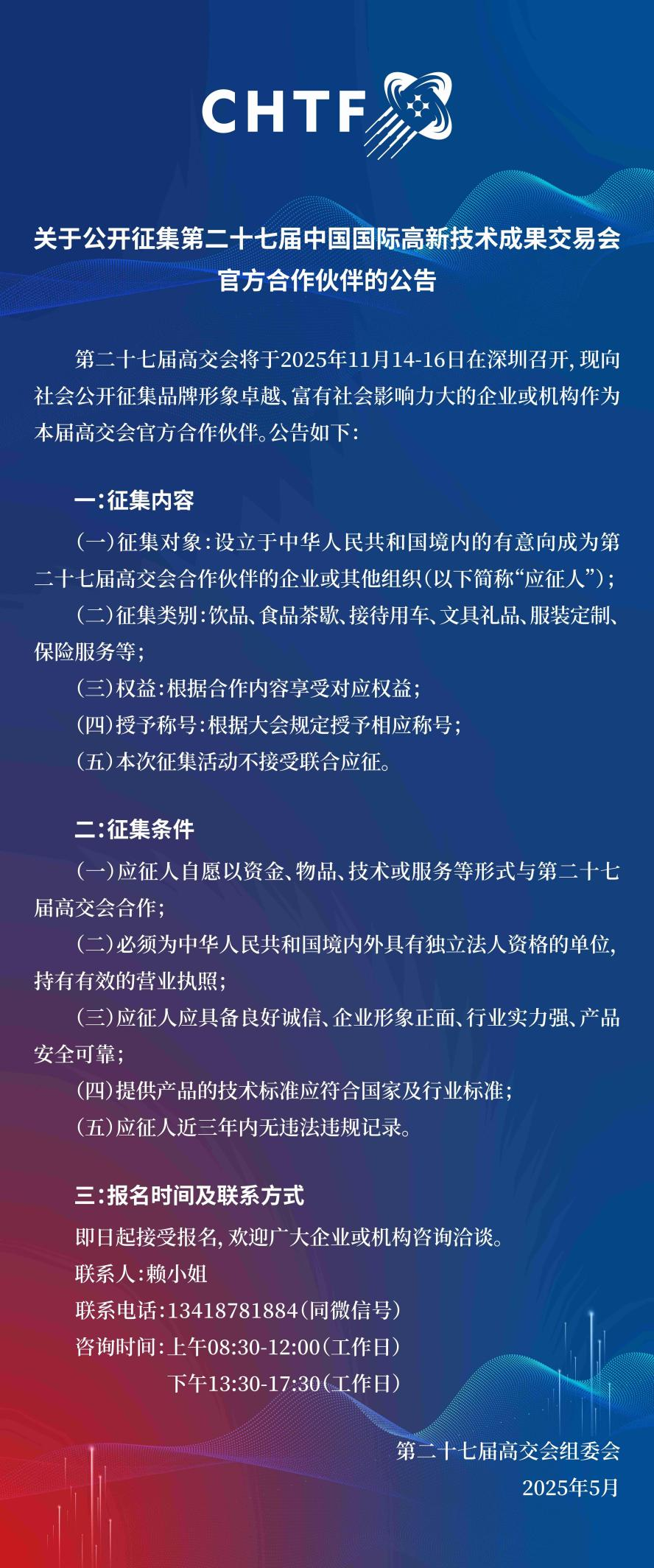 鉴于“第二十七届中国国际高新技术成果交易会”的各类意向赞助企业在企业战略宣传上的需求各有不同,高交会组委会在秉承提供全面的贵宾礼遇外,礼遇权益部分可根据企业的“—事一议”原则做调整。赞助权益等详细方案请点击“阅读原文”获取