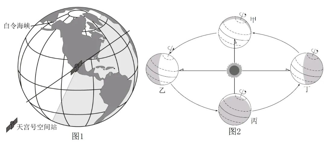 2024年10月30日,神舟十九号顺利发射。图1为某日天宫号空间站位置及运行轨道示意图。图2为地球公转示意图。读图,完成下面小题。