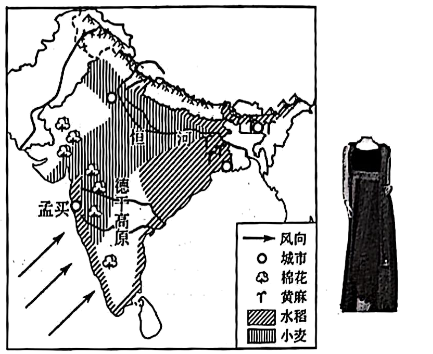 2024年7月23日、第八届中国—南亚博览会在云南昆明开幕。来自印度等南亚国家展出了漂亮的纱丽。纱丽是印度、巴基斯坦等国家女性的一种传统服饰、常以棉花、黄麻、蚕丝为原料,质地轻薄,透气性好。下图分别为南亚主要农作物分布图及印度展出的纱丽成衣图。据此,完成下面小题。