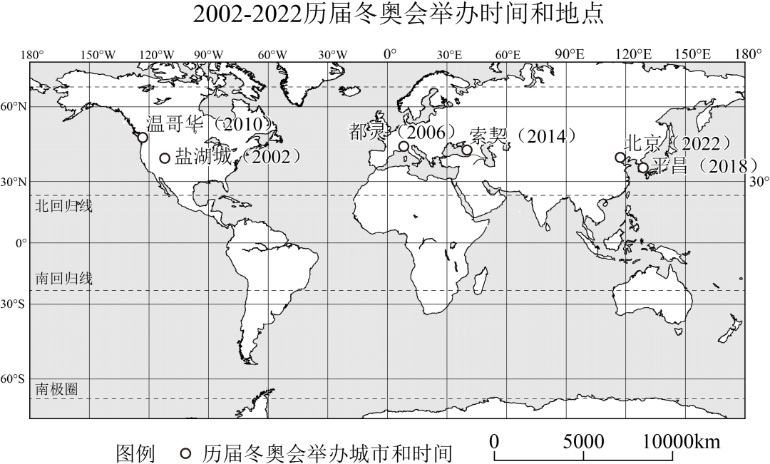 2026年冬季奥运会将在意大利的米兰和科尔蒂纳丹佩佐两座城市举办。下围为近六届冬季奥运会举办城市分布示意图。读图,完成下面小题。