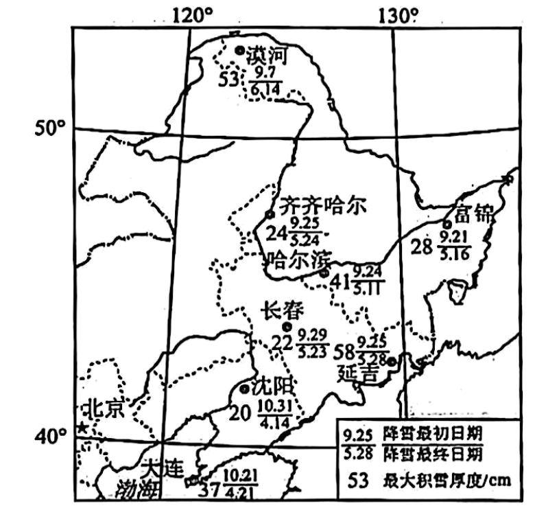 (3)哈尔滨冰雪大世界用冰用雪量较大,读图分析东北的雪期长短在空间变化上有 ________规律。延吉被称为“雪乡”,试从地理的角度分析“雪乡”形成的原因_____________。