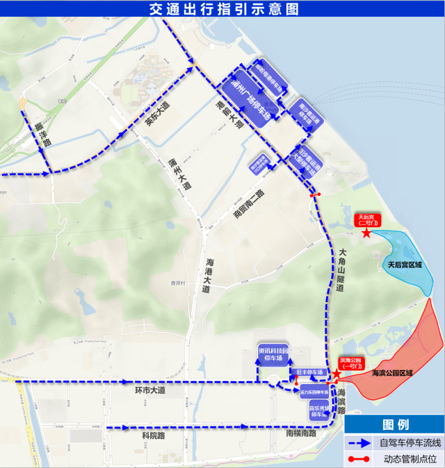 1、非观灯车辆建议绕行 海港大道、商贸南二路 等外围道路。