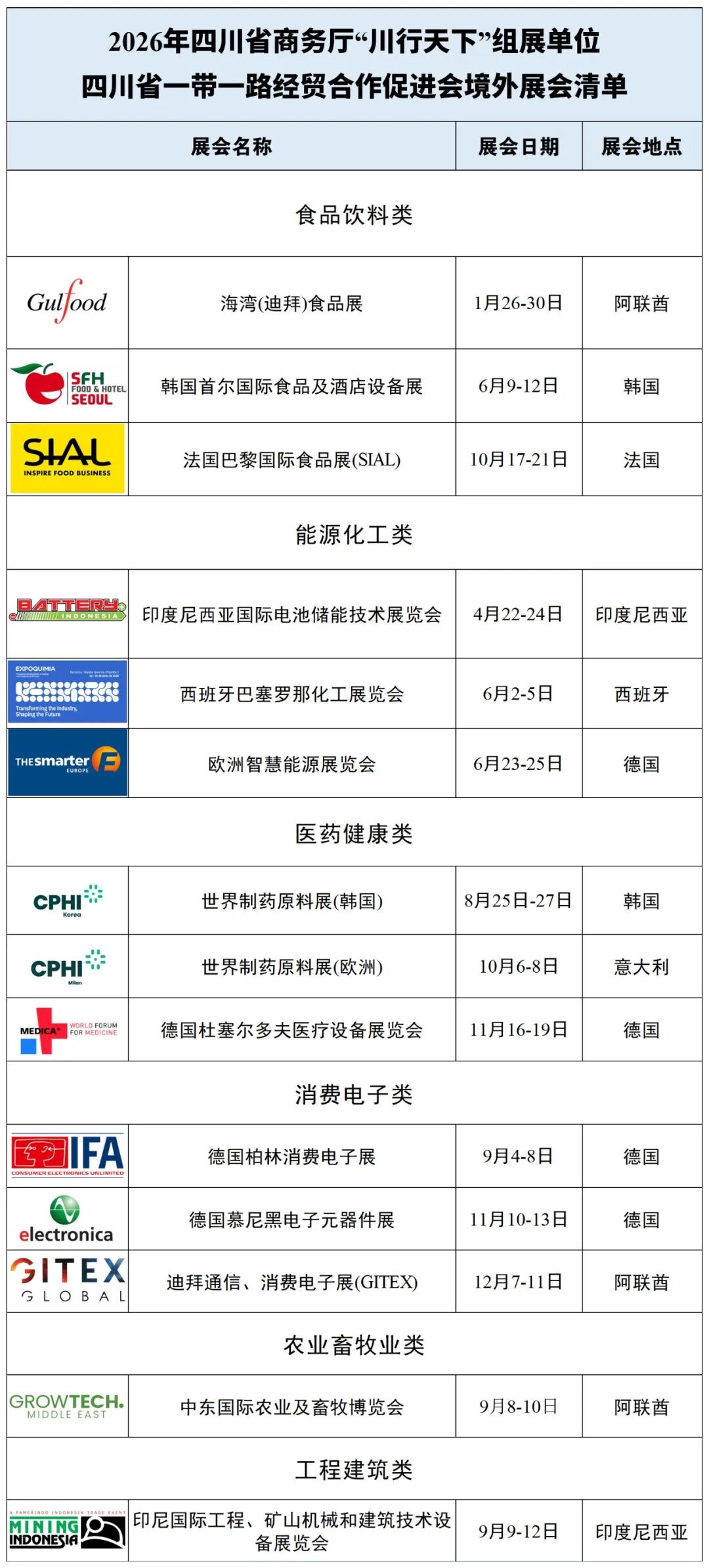 该展会是2026年“川行天下”国际市场拓展活动中的重点展会,按照四川省商务厅《“川行天下”国际市场拓展支持政策》(川商贸促〔2026〕1号)要求,对符合条件的参展企业予以80%展位费用支持(单个企业不超过9万元)。