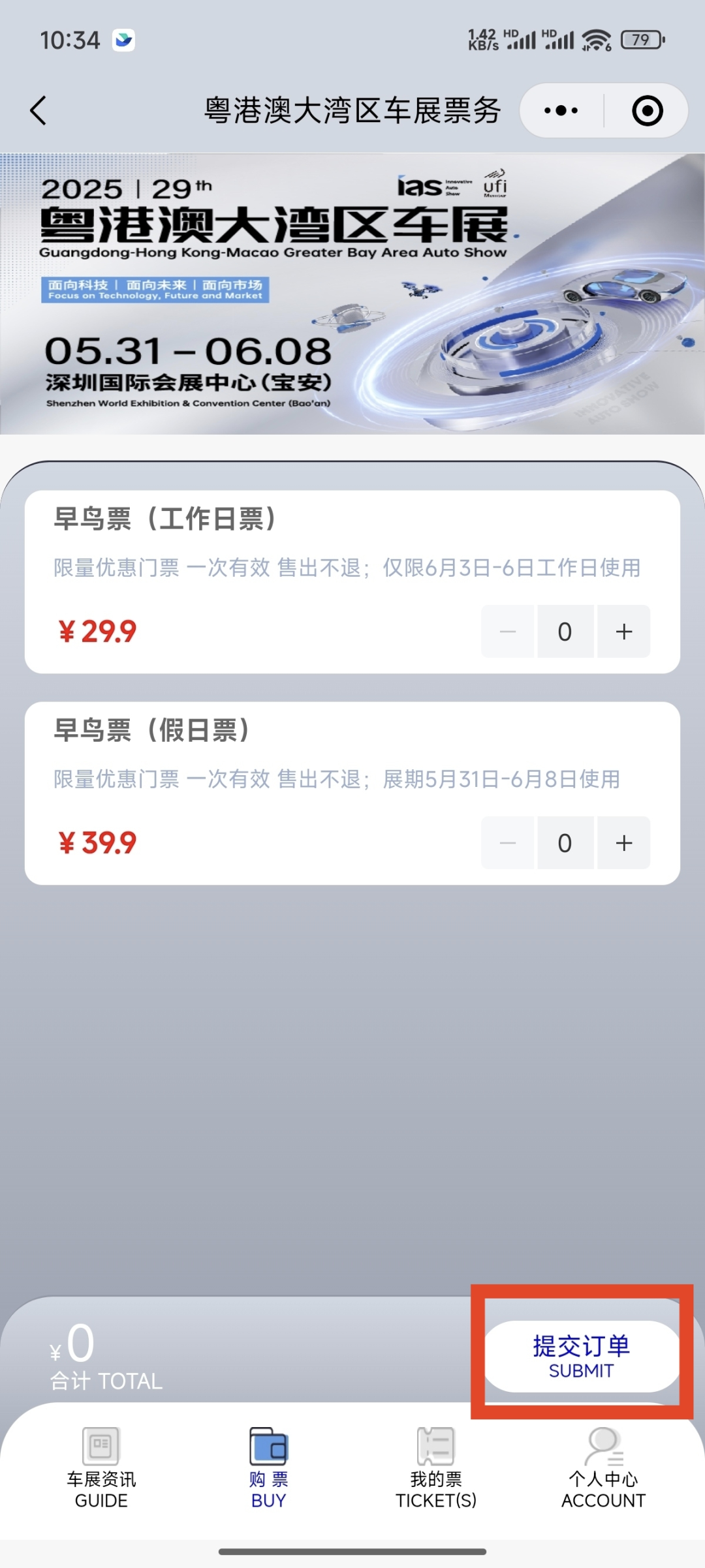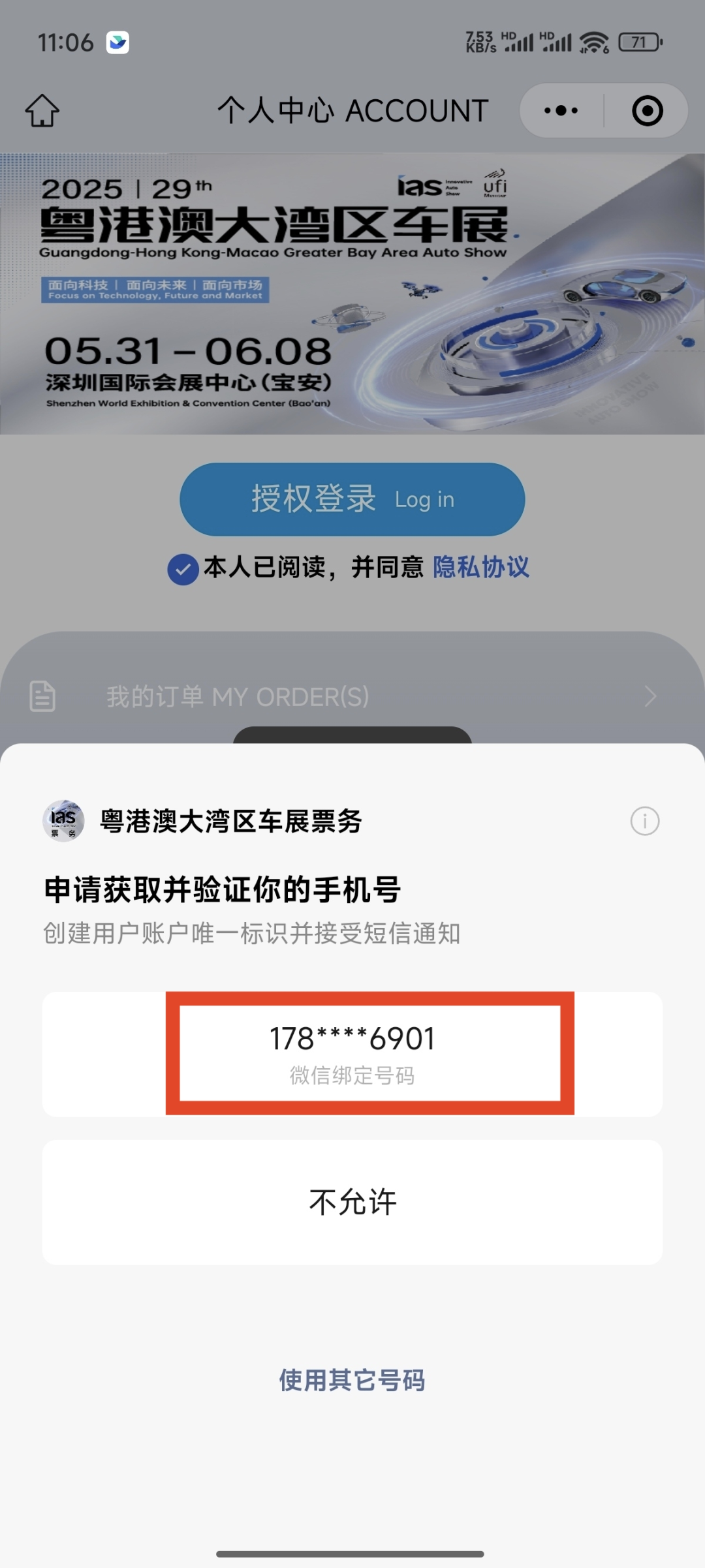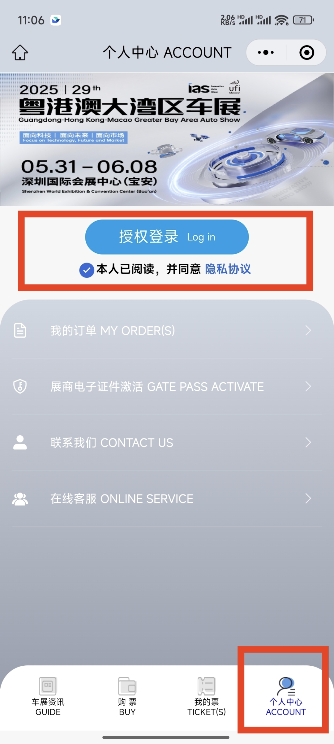 打开“粤港澳大湾区车展票务”小程序,点击个人中心,授权登录。(或者点公众号主页服务栏-早鸟票进入)