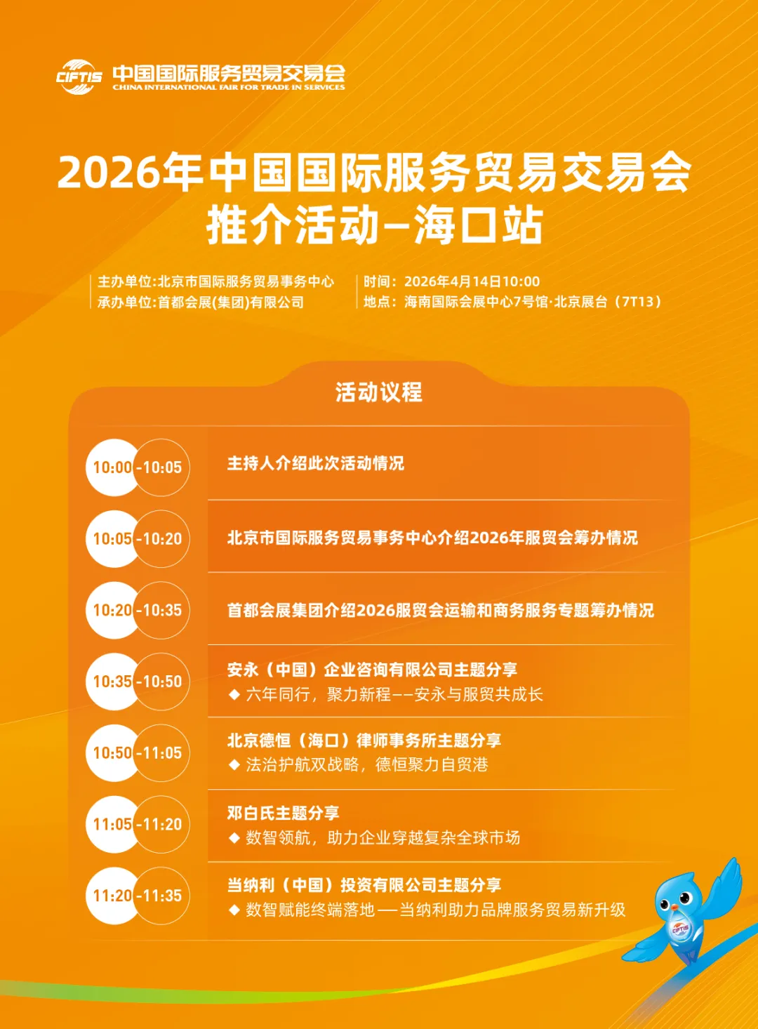在第六届消博会期间,2026年服贸会推介活动——海口站将于今日(4月14日)上午10:00在海南国际会展中心7号馆北京展台(7T13)精彩亮相。