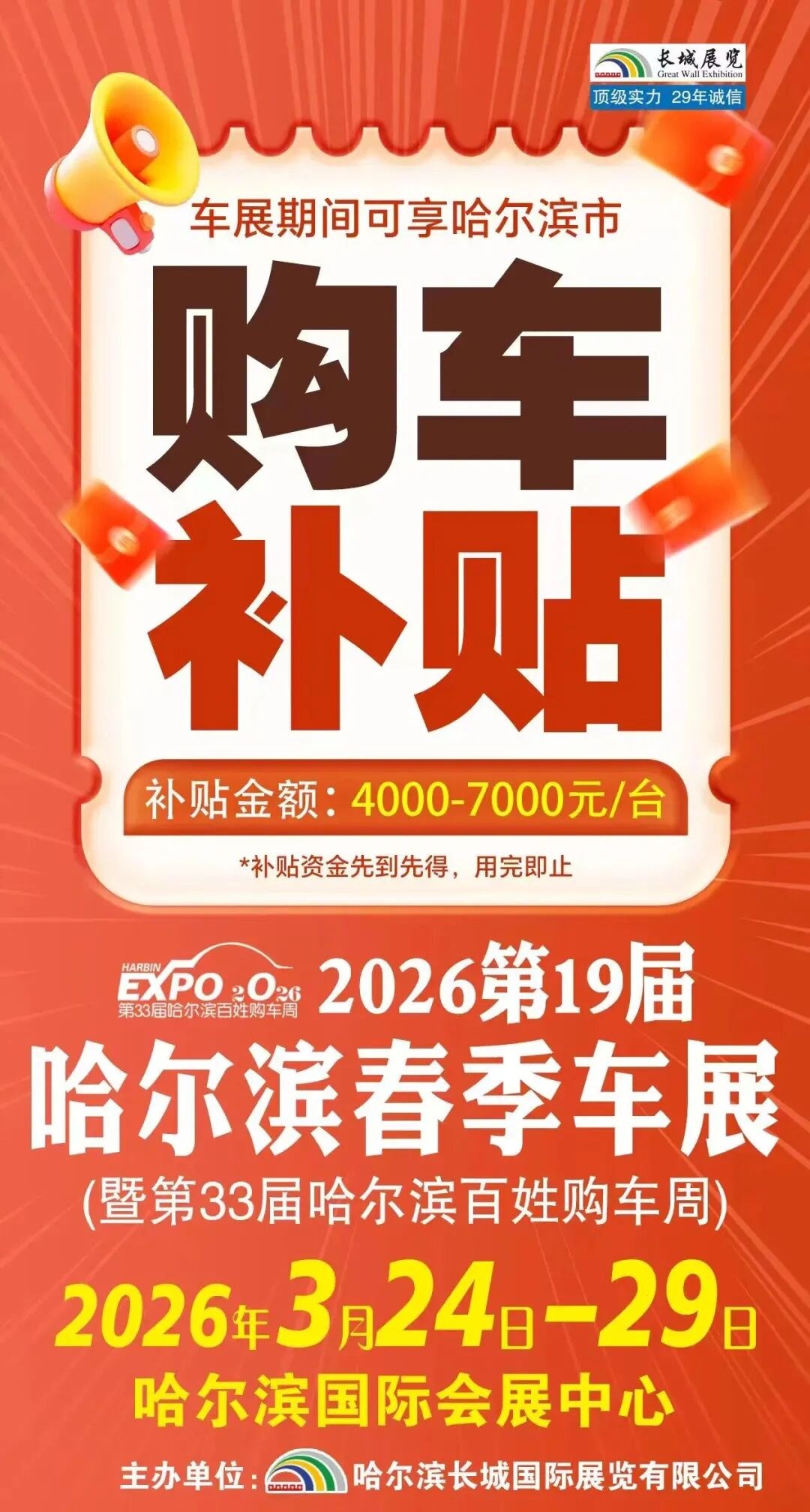 专属购车补贴,真金白银省到家,车展期间可享哈尔滨市购车补贴,单台补贴金额4000-7000元!补贴资金先到先得,用完即止。