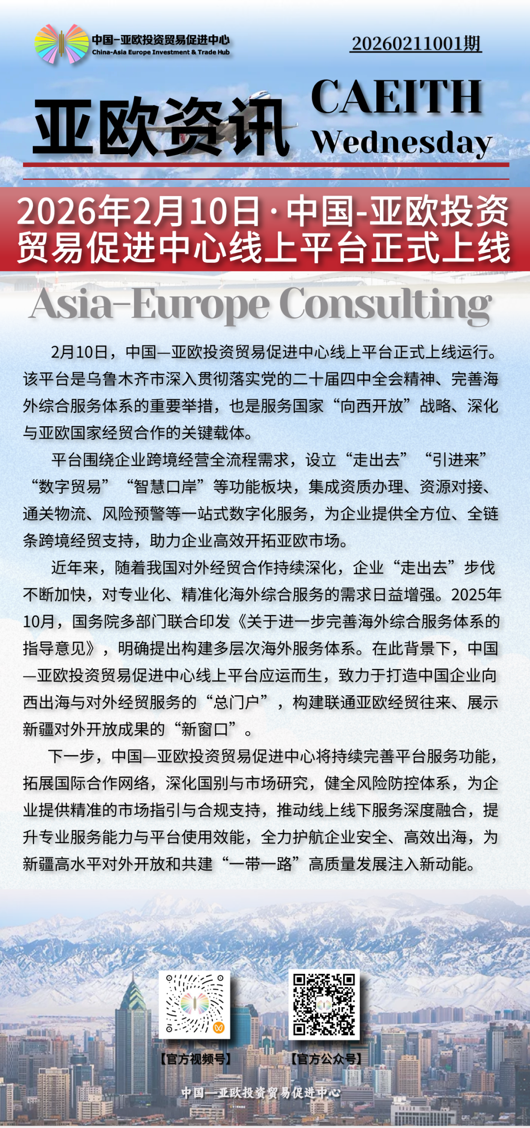 中国—亚欧投资贸易促进中心是国家《中国(新疆)自由贸易试验区建设实施方案》的改革试点项目,由新疆亚欧投资贸易促进中心有限公司负责运营。中心聚焦"信息共享、政策咨询、投资对接、贸易促进"四大功能,打造"一站式"国际综合服务平台,提供政务、法律、财税、金融、商务、科技、物流、文化、人才九大服务体系,构建"服务出海—贸易出海—投资出海"全链条服务模式。作为亚欧经贸合作的重要枢纽,中心致力于推动"一带一路"高质量发展,打造国际经贸服务示范平台。