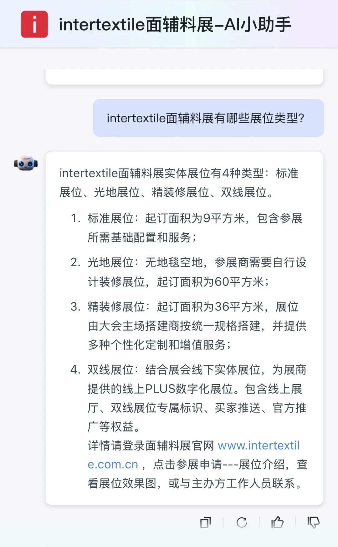 无论您是资深观众还是萌新观众,想要提前了解观展讯息的小伙伴,均可在intertextile面辅料展“AI小助手”对话框输入具体问题或关键词,检索获知相关展会讯息,快问快答,便捷高效!同时,还能get展会最全“观众服务”!