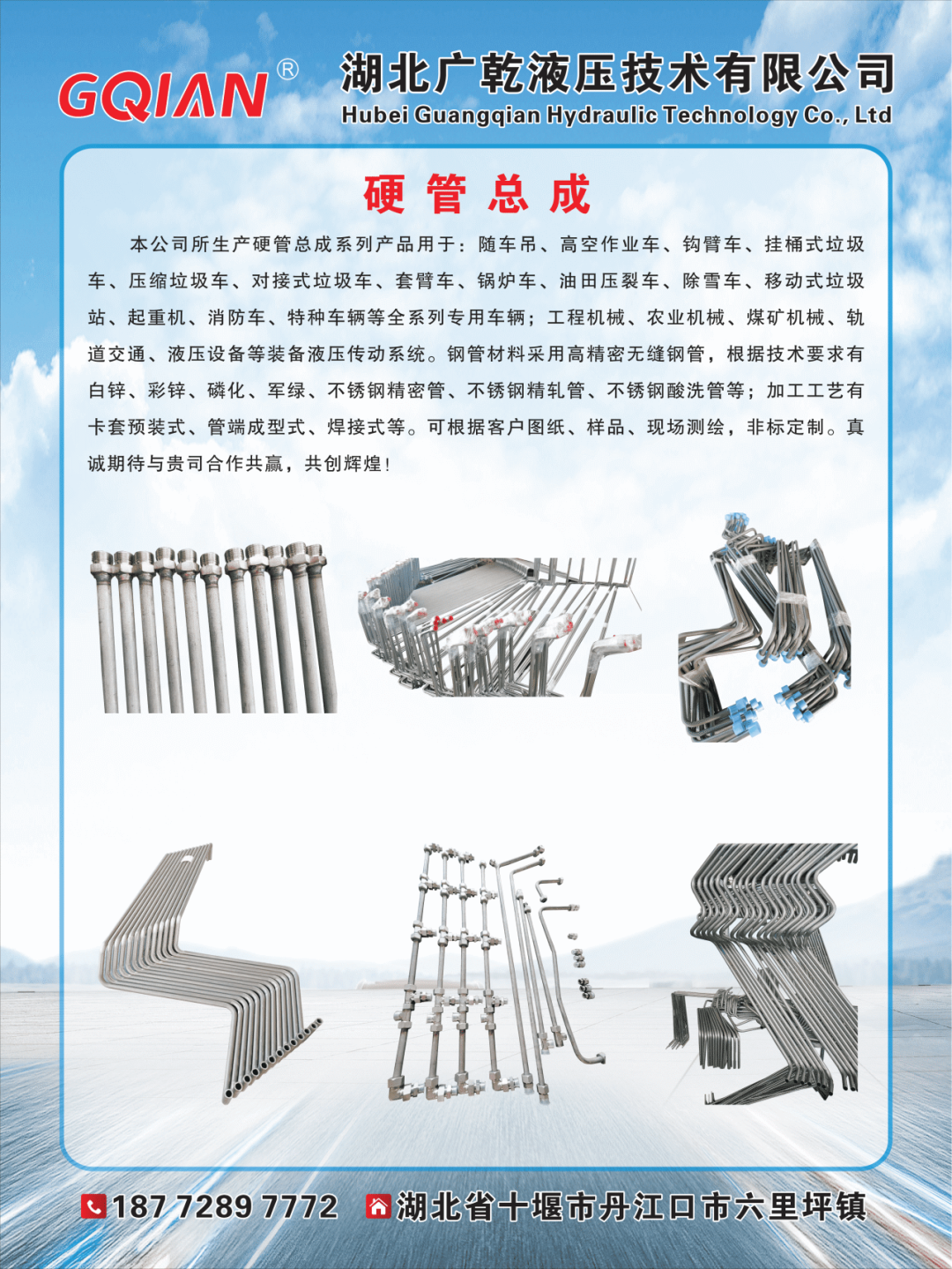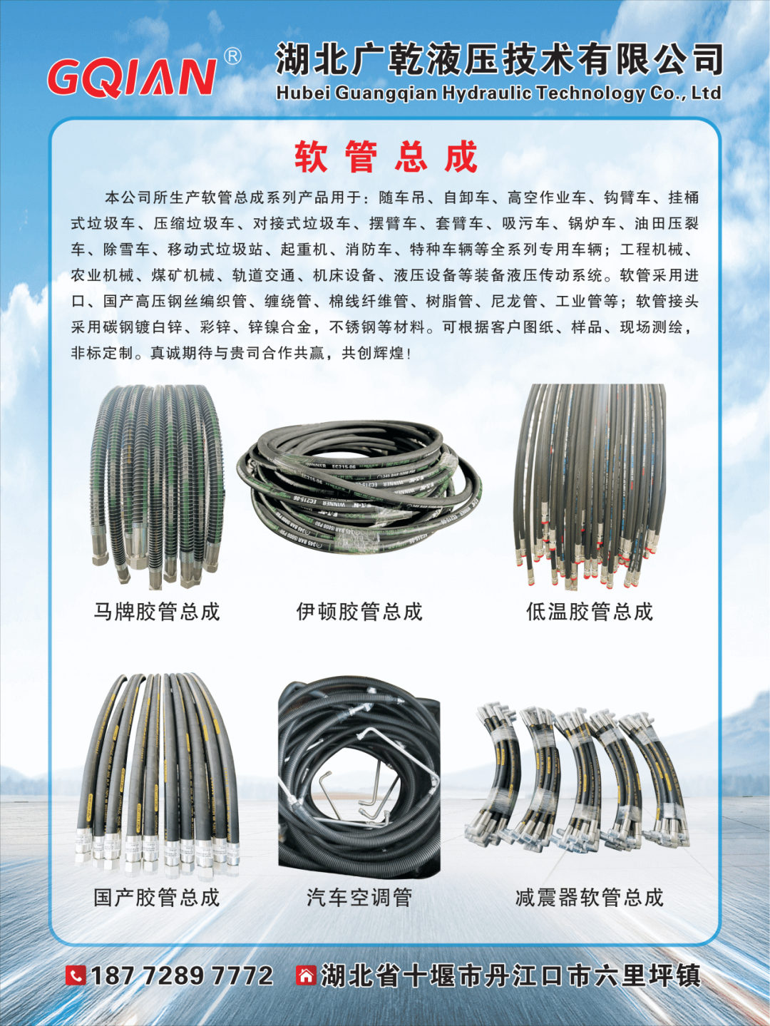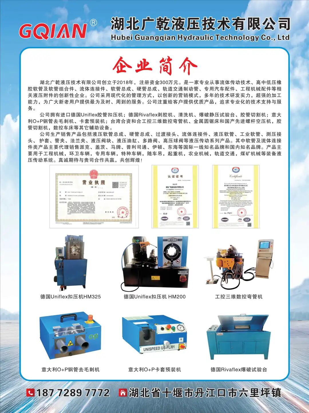 湖北广乾液压技术有限公司成立于2021年,注册资金300万元。是一家专业从事流体传动技术、高中低压橡胶软管及软管组合件、流体连接件、软管总成、硬管总成、轨道交通制动管、专用汽车配件、工程机械配件等相关液压附件的创新性企业。公司采用现代化的管理方式,以创新的营销模式,多年的技术研发实力,超强的加工能力,为广大新老用户提供最为及时、周到的服务。公司注重给客户提供优质产品,追求专业化的技术支持与服务。