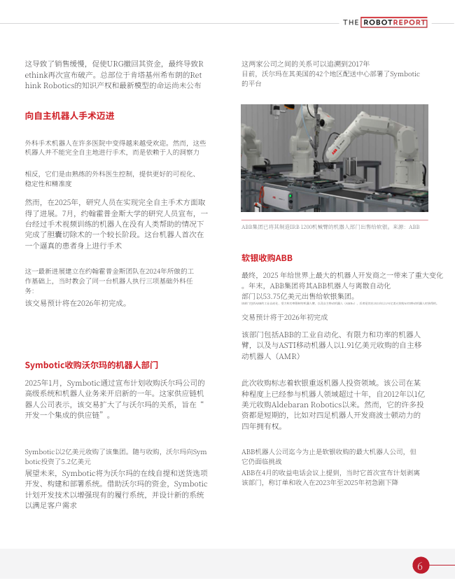 亚马逊部署了第100万台机器人,运营着全球最大的工业移动机器人车队。软银以53.75亿美元收购ABB机器人及离散自动化部门,涵盖工业机械臂、协作机器人和自主移动机器人,预计2026年初完成交割。