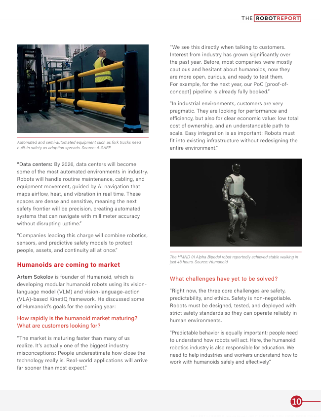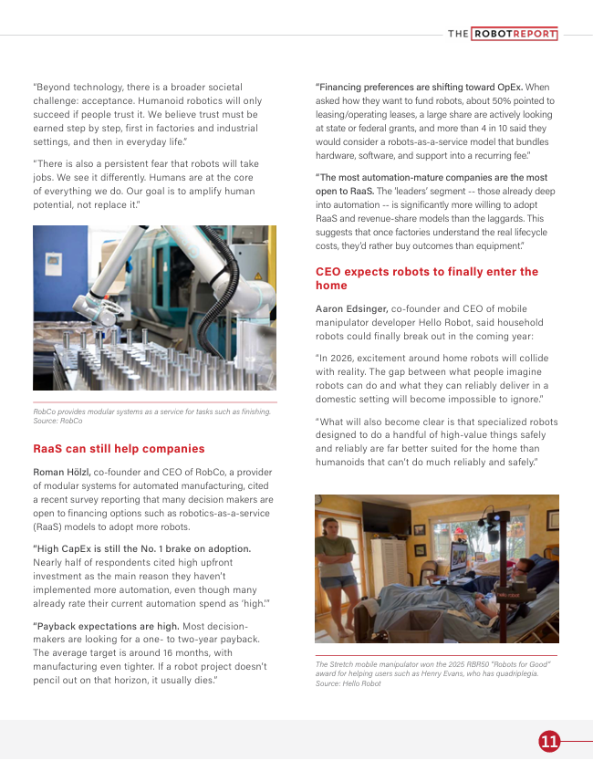 The Robot Report执行编辑Steve Crowe指出:“经过几年的病毒视频、飙升的估值和对通用能力的大胆宣称,2026年人形机器人需要翻开新篇章。进步将不再以机器人在展会上有多‘运动’来衡量,而是以它能否为客户安全地交付增量价值。”