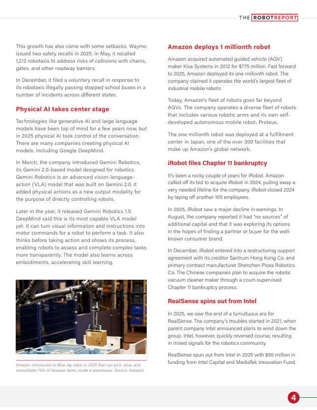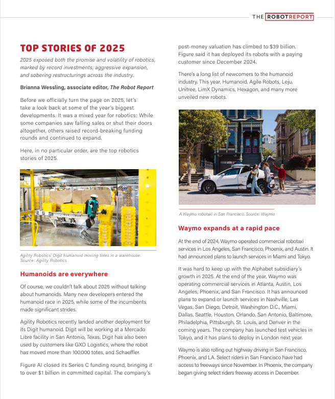 2025年,机器人行业交出了一份“冰火两重天”的成绩单。Waymo在五大城市运营商业Robotaxi,亚马逊部署了第100万台机器人,Figure AI以390亿美元估值完成超10亿美元融资。但与此同时,iRobot申请第11章破产,Rethink Robotics二次倒闭,Teradyne机器人部门一年内两次裁员。