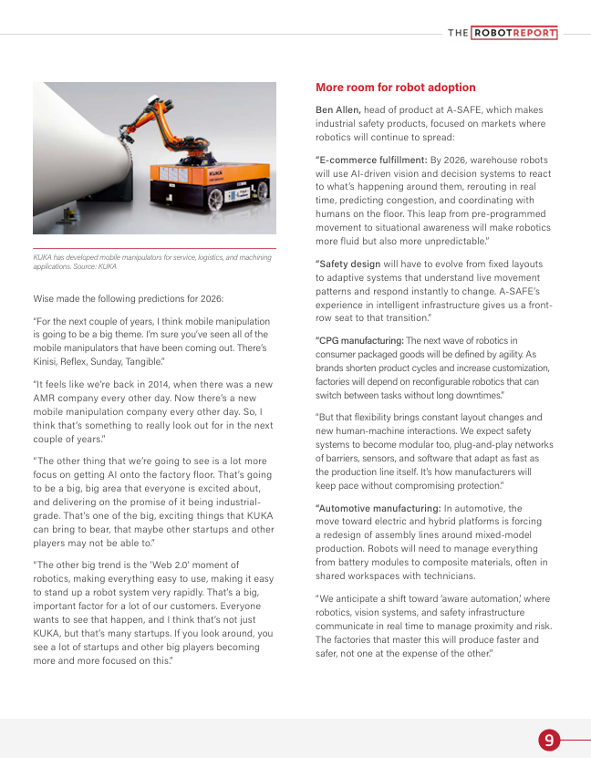 Fetch Robotics联合创始人、前Agility CPO、现任KUKA CPO的Melonee Wise预测:“未来几年,移动操作将成为一个大主题。感觉我们回到了2014年——那时每隔一天就有一家新的AMR公司,现在每隔一天就有一家新的移动操作公司。”