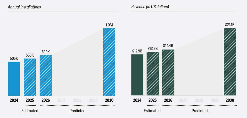 Deloitte预测,生成式AI的进步“到2030年可能推动年工业机器人销量突破100万台,收入超200亿美元”。全球工业机器人保有量2026年可能达到550万台。