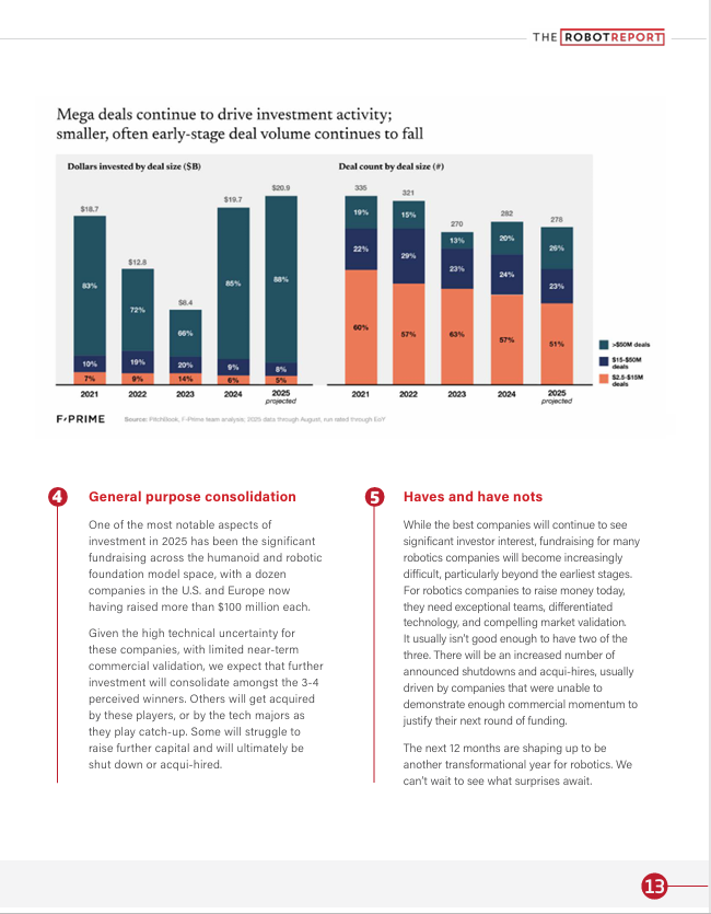 “最好的公司将继续看到显著的投资者兴趣,但许多机器人公司的融资将变得越来越困难。如今机器人公司要融资,需要卓越的团队、差异化的技术和令人信服的市场验证。”