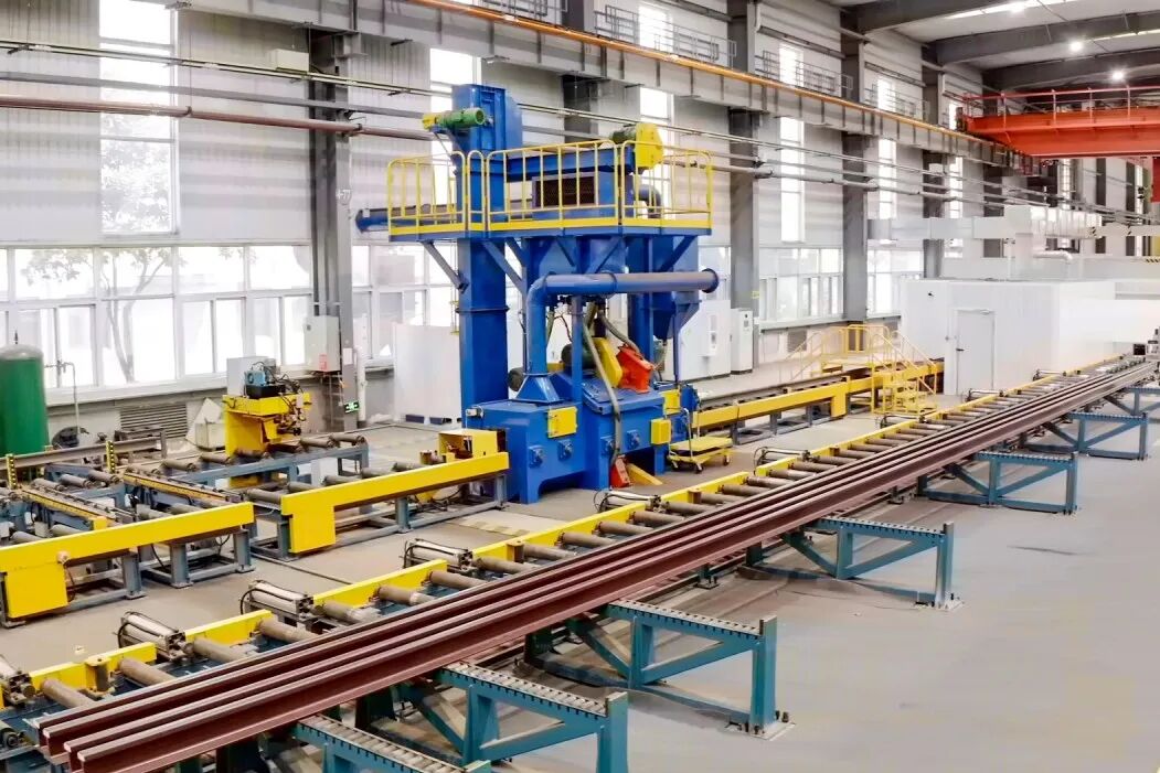 道岔钢轨自动配料与涂装数智化生产线主要由锯床自动锯切系统、钢轨表面除锈系统、喷漆房及废气处理系统、烘干系统、输送系统、PLC 控制系统、工控机软件系统等部分组成。可实现多种轨型的道岔钢轨件的拉料锯切、传输、除锈、涂装、烘干、废气处理的自动化生产。