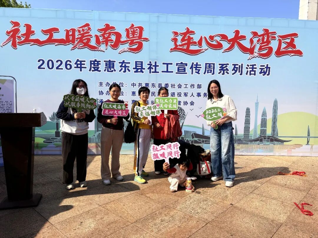 春风送暖南粤地,湾区同心社工行。为进一步展示惠东县专业社会工作发展成果,提升社会工作社会知晓度与影响力,推动社工队伍建设高质量发展,3 月 17 日上午,“社工暖南粤 连心大湾区” 2026 年惠东县社工宣传周活动在南湖公园北门广场顺利举办。本次活动由中共惠东县委社会工作部主办,惠东县民政和退役军人事务局协办,惠东县社会工作者协会承办,为惠东市民带来了一场沉浸式的社工知识普及与服务体验盛宴。
