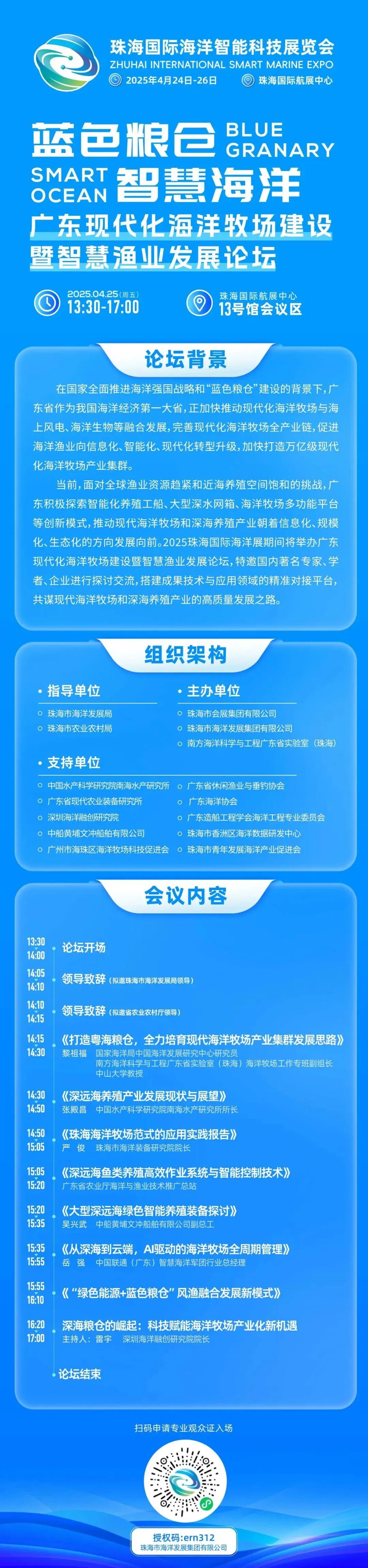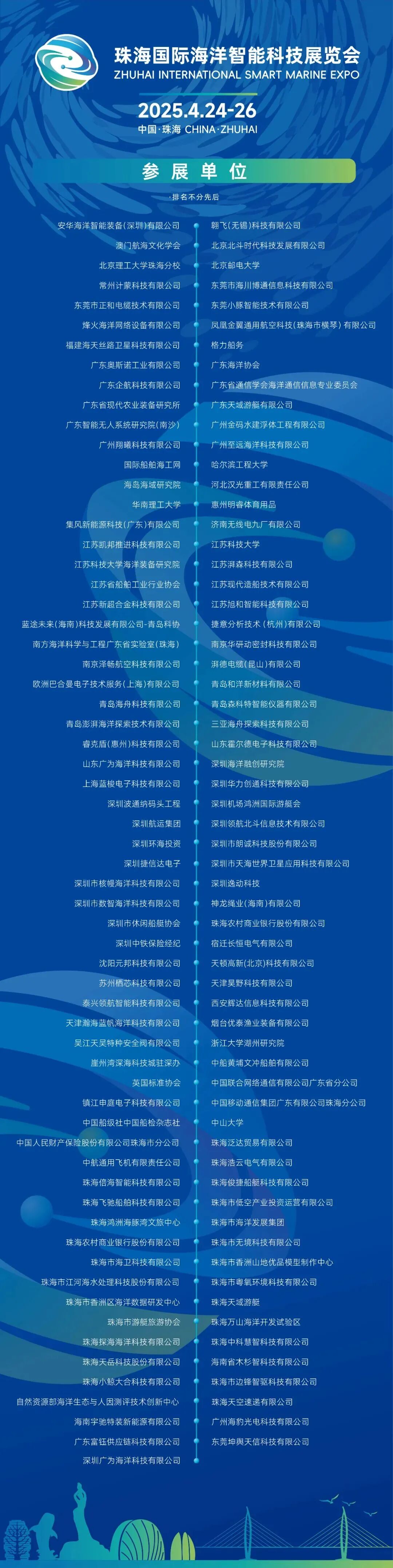 2025珠海国际海洋智能科技展览会(简称“2025珠海海洋展”)将于2025年4月24-26日在珠海国际航展中心举办。本届展会预计将汇聚超过200家海洋智能及无人装备、海洋新能源、智慧船舶、海洋防腐及新材料、海洋牧场及深海养殖装备、游艇、海岛开发及旅游等海洋领域企业参展,规划展会面积3万平方米。