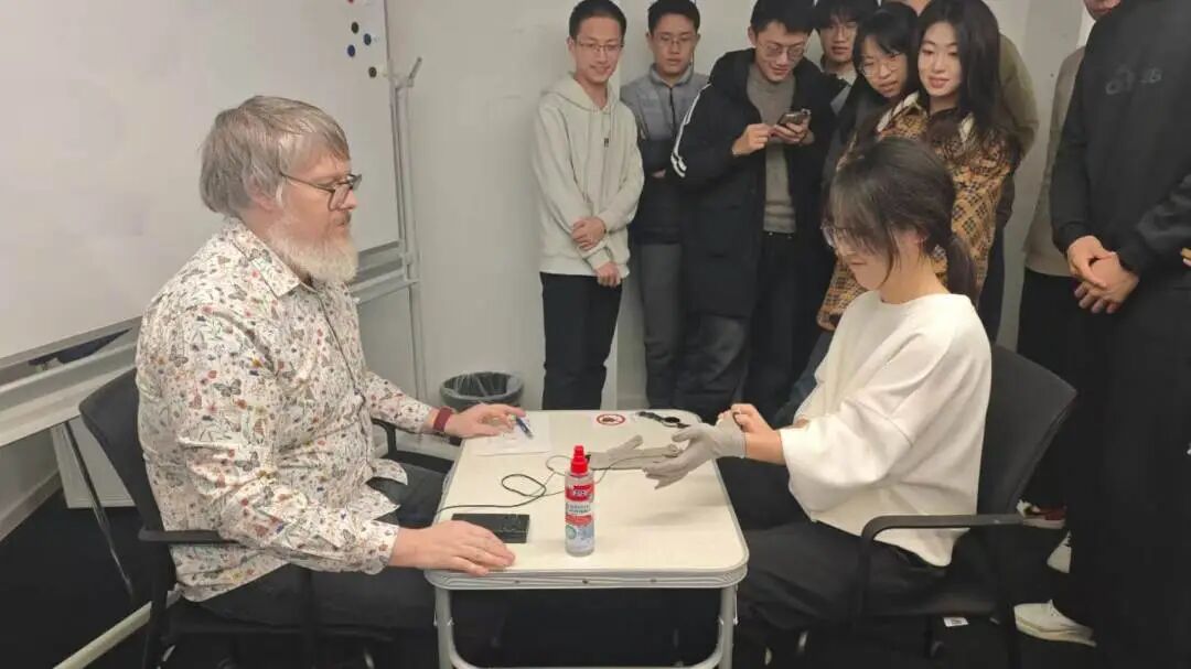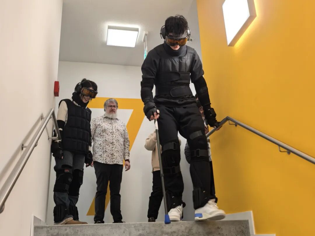 实地体验与动手实践,成为本次冬季学校的一大亮点。在ITA工坊,同学们亲手操作协作机器人完成抓取任务,直观感受其安全灵活的人机协作特性,通过自动导引车和纺织生产传感器系统,真切体会数据驱动下的生产监控与流程优化;在IAW环节,Alexander Mertens教授邀请同学们试穿拟老化装备GERT,模拟老年群体视力模糊、听力下降、关节僵硬等生理状态完成日常动作,让大家深刻理解产品设计中年龄包容的重要性,真切感受“人本包容”与“数字创新”的深度融合。