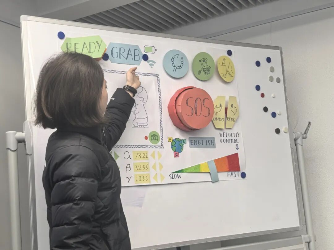 冬季学校始终坚持理论与实践结合,在IAW相关培训后,同学们走进培训车间,体验手机支架生产全流程,从打孔、折叠到装配,在一个个细微环节中探寻人体工学生产工艺设计的奥秘。与此同时,以“设计机械臂控制界面”为主题的小组项目同步开展,同学们从构想使用场景、制作纸面模型,到收集用户反馈、反复优化细节,全程沉浸式参与设计与研发。在成果展示环节,各小组的巧妙构思与清晰讲解,赢得了授课老师的充分认可。