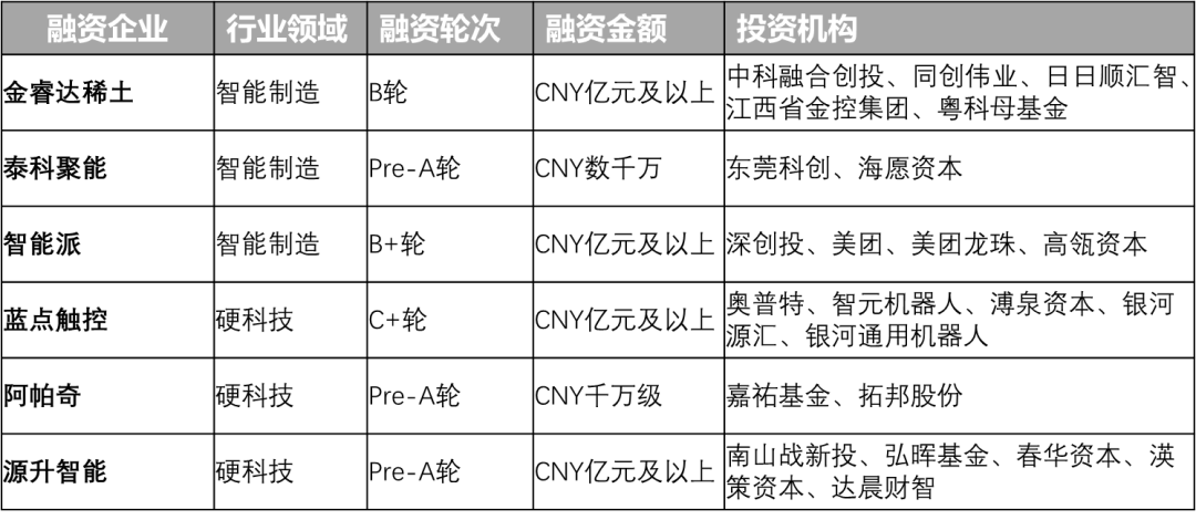 投资方:中科融合创投、同创伟业、日日顺汇智、江西省金控集团、粤科母基金项目简介:金睿达稀土是一家高性能稀土永磁材料研发商,主营业务为高性能稀土永磁材料产品的研发、生产和销售,掌握径向8级小磁环技术、无重稀土钕铁硼技术和铈钕铁硼技术三大核心工艺,构建起从稀土原料、毛坯生产到精密加工、定制化解决方案的全链条生产能力,实现研发设计、模具开发到磁组件集成的全流程自主布局,全面打通稀土永磁材料“研-产-供-用”全产业链。项目简介:泰科聚能是一家锂电材料技术研发商,专注于新能源材料的研发和产业化,产品线包括固态电解质和高性能锂电添加剂。同时聚焦于下一代电池的高容量长循环高安全技术,为电池企业提出整体解决方案。项目简介:智能派是一家消费级3D打印机研发商,专注于消费级3D打印机、激光雕刻机及STEM套件研发与生产,产品主打高精度光固化(如SATURN系列)和FDM(熔融沉积)双技术路线,产品以易用性著称,支持手机APP一键打印、无线传输、自动调平。投资方:奥普特、智元机器人、溥泉资本、银河源汇、银河通用机器人项目简介:蓝点触控是一家机器人力传感器研发商,公司专注于机器人前沿力控技术的研发与产业化,已搭建涵盖高性能弹性体设计、嵌入式硬件电路、高精度结构解耦算法及六维同步校准在内的四大平台型技术,形成人形机器人专用力传感器、通用力传感器、力控综合解决方案及复合型机器人工作站等多元化产品体系。项目简介:阿帕奇是一家具身智能技术研发商,主要从事“大小脑控制器”及具身行业套件研发业务,并提供覆盖“大脑+小脑”的一体化控制与算力方案。投资方:南山战新投、弘晖基金、春华资本、渶策资本、达晨财智项目简介:源升智能是一家高性能灵巧手研发商,公司聚焦高性能灵巧手赛道,核心产品为Apex Hand高性能灵巧手,面向具身智能、人形机器人、工业精密操作、科研开发等领域,为行业提供可量产、高可靠的灵巧操作硬件与解决方案。在此,厚福资本再次恭喜以上获得融资的企业,未来业绩长虹,行稳致远,不断通过科技创新助力中国实体经济的高质量发展。