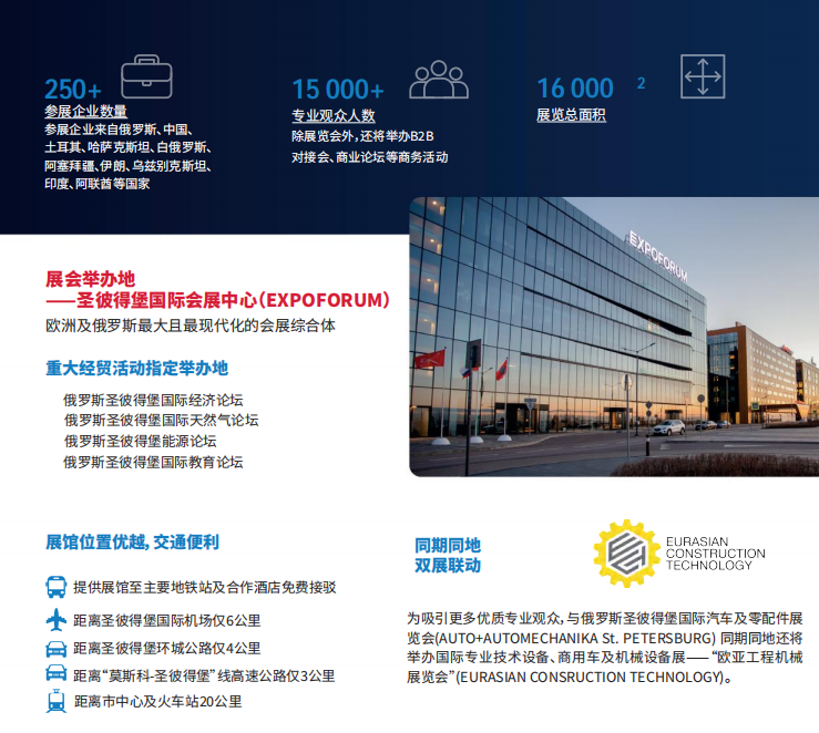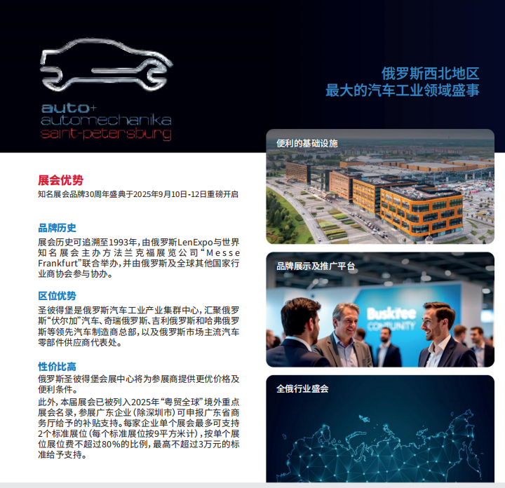 St.PetersburgInternationalAuto Show (SPIAS)展会地点:俄罗斯圣彼得堡EXPOFORUM国际展览中心 俄罗斯圣彼得堡汽车及零配件展览会是俄罗斯汽车行业不容错过的一场国际盛事,该展 会汇聚国际知名汽车制造商、乘用车及商用车经销商,吸引全球汽车行业的专业人士,将为 参展企业提供全方位展示平台,助力开拓俄罗斯市场的中国企业扩大客群基础,提升品牌知 名度及客户粘性。展会官方合作伙伴俄罗斯“EXPOFORUM”展览中心是全球最佳会展中心 之一,也是欧洲和俄罗斯最现代化的会展中心,将为广大展商及各地观众提供更优质的软硬 件服务保障。 目前,中俄两国全方位合作不断加强,中俄双边贸易增速在中国主要贸易伙伴中位列第 一,俄罗斯已成为中国汽车出口第一大国。当前俄罗斯汽车市场表现出强劲的增长态势,2024 年前10月,俄罗斯新车销量同比增长48%;2024年前9个月俄罗斯进口中国汽车数量近 85 万辆。根据俄罗斯“AvitoAuto”统计,中国汽车在俄市场占有率已达68%;根据俄罗斯汽车 市场分析机构“Autostat”统计,俄罗斯销量前五的汽车品牌中,本土汽车品牌拉达位列第一, 其余四名皆为中国汽车品牌,分别是哈弗、奇瑞、吉利和长城。相关分析指出,中国品牌在 俄稳定化将是俄罗斯新车市场的主要趋势之一,中俄汽车合作领域发展势头强劲。 展会举办地俄罗斯圣彼得堡是俄罗斯最大的经济中心之一,具有独特的地理位置优势, 是波罗的海沿岸重要交通枢纽和港口,具有显著的经贸优势。圣彼得堡也是俄罗斯四大工业 区之一,聚集大量汽车制造企业,在当前背景下,对中国进口的汽车相关需求及潜力巨大, 也是中国企业赴俄考察、了解市场及竞品的重要窗口。 【展品范围】 汽车零部件及组件 电子及智能网联 配件及改装 维修与诊断 机油及机车化学品 汽车清洗与保养 轮胎及轮毂 移动出行服务及自动驾驶 商用车(轻型及重型) 大巴车 车身,拖车和半挂车 信息处理、导航设备 监控系统、车队管理系统 筑路机械设备 【政策解读】 跨境服务 物流服务 根据广东省商务厅关于《2025年“粤贸全球”广东商品境外展览平台》的公示,“2025年 俄罗斯圣彼得堡汽车及零配件展览会”已被列入2025年“粤贸全球“广东境外商品展览平台, 参展广东企业可享补贴政策扶持(具体以省商务厅公示为准)。根据2024年补贴标准,参加经广东省商务厅比选确定的“粤贸全球”境外(俄罗斯)展会的企业,单企单展可申请2个 标准展位(每个标准展位按9平方米计),单个展位费用按最高80%且最高不超过30,000 元的补贴支持