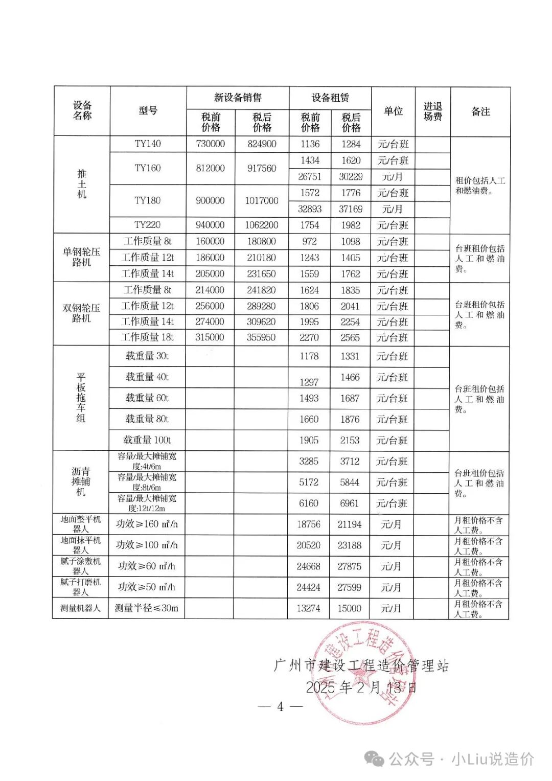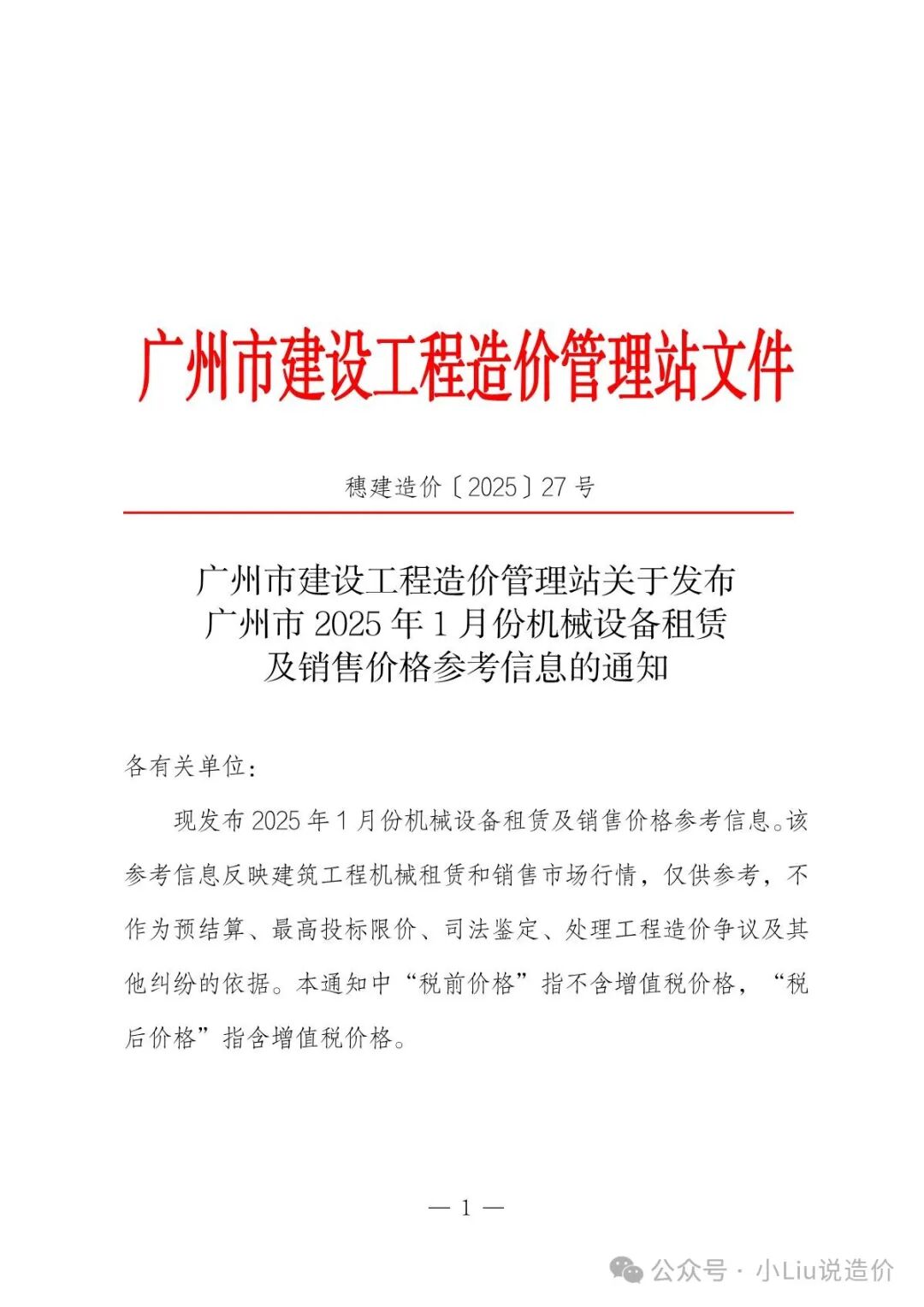 2025年1月份广州市机械设备租赁及销售参考价格!文末可下载完整PDF版文档!完整PDF版附件点击下载:关于发布广州市2025年1月份机械设备租赁及销售价格参考信息的通知.pdf----END----ps:更多实用资料,请关注本公众号,私信留言领取!来源:广州市造价站