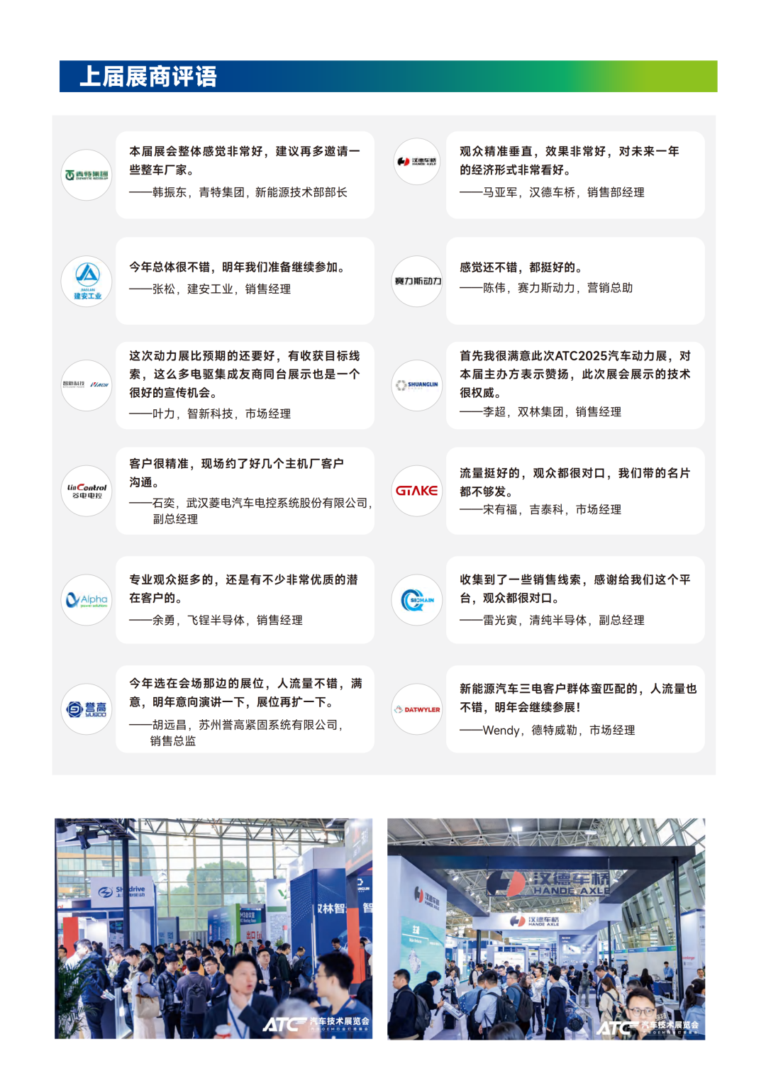 ATC 上海国际汽车动力系统技术展览会:行业破局的核心平台历经多年积淀,ATC 上海汽车动力展已成为 汽车 OEM 行业的灯塔展会 ,2026 年 6 月 3-5 日将在上海新国际博览中心重磅升级。本届展会以「展览 + 高端峰会」双引擎模式,聚焦传统动力总成、电驱动、混合动力、智能制造成等汽车动力系统上下游全产业链,为企业搭建技术展示、客户对接、行业交流的一站式平台。基于 2025 年展会真实数据,参展企业可获得多重核心价值:2025 年展会吸引 25,326 人次专业观众,其中 41% 为整车厂(乘用车 + 商用车)、21% 为 Tier1 总成供应商,现场 3,228 位观众参与集章打卡,参展企业可直接对接上汽、比亚迪、蔚来、一汽解放等头部整车厂及优质供应链客户;同期举办电驱动、混合动力、商用车动力 3 场高层闭门会,6 大专业技术峰会(含电驱动系统、驱动电机、功率半导体等),200 + 行业大咖深度分享,300 + 行业热点话题探讨,预计吸引 10,000 + 技术会议听众;抖音投流预计曝光 7,957,006 次,微信朋友圈投流预计曝光 5,824,439 次,ATC 及三电公众号精准触达 150,000 专业群体,数百家合作媒体同步宣传,平均潜在受众 622.3W,预计阅读量 445,534 次,线上逛展直播总观看人数超 3,500 人,采访 80 + 展商,实现线上线下联动曝光;上届展商数据显示,98% 的展商认可展会行业专业性,95% 计划继续参加 2026 展会,90% 会推荐给商业伙伴,87% 对本届展会总评价满意,85% 认为展会对公司收益大。2026 展会规划 20,000+㎡展示面积,预计超 400 家展商参展、20,000 + 专业观众到场。核心展位位于展会主通道、观众入口核心动线,是观众逛展的必经之路,可最大化曝光品牌、承接精准客流;同时核心展位可优先参与高层闭门会、嘉宾访谈、逛展直播等同期活动,获得额外品牌曝光与客户对接机会。无需立即决策,我们可为您免费提供:2026 展会最新展位布局图、目标客户观众画像分析、同期峰会参会名额预留、专属参展方案定制,帮您全面评估参展价值,找到最适合企业的展示方案。关注我,回复「动力展」即可获取 2026 展会最新资讯、展位余量、同期峰会日程;也可直接私信我们,预约 1 对 1 专属咨询,提前锁定核心展位与行业资源,共话汽车动力产业未来发展。