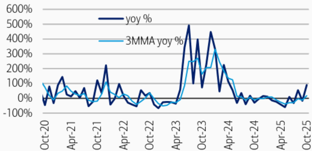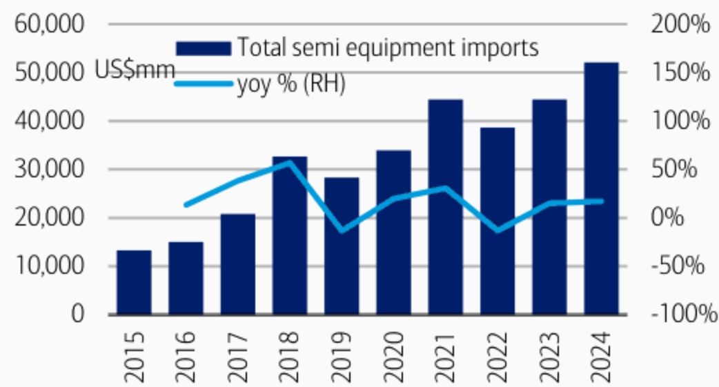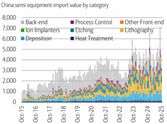 根据美银全球研究最新发布的《中国半导体设备进口追踪报告》,2025年10月中国半导体设备进口额达到46亿美元,同比增长15%,但环比下降36%。这一数据反映出中国半导体产业在复杂国际环境下的持续发展态势。