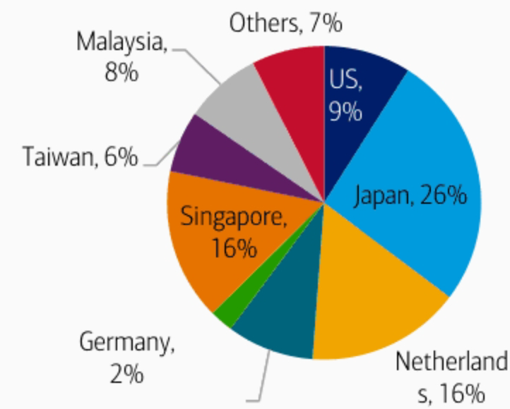从国家来源看,日本和荷兰是中国半导体设备进口的主要来源国,2025年前10个月合计占进口总额的42%。其中日本占26%,荷兰占16%,其他重要来源国包括新加坡(16%)、马来西亚(8%)和台湾地区(6%)。