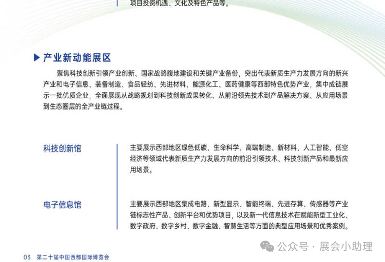 西博会设有西博会25周年成果展和开放合作、产业新动能、美好生活三大展区,共15大主题展馆。其中,医药健康馆聚焦“健康中国”战略,展示了大量前沿医疗设备和创新药械;科技创新馆电子信息馆则展示了5G人工智能等数字技术的最新应用场景和标杆项目‌12。此外,西博会还首次设置了双主宾国和双主宾省,进一步深化与共建“一带一路”国家的经贸投资和人文交流‌。